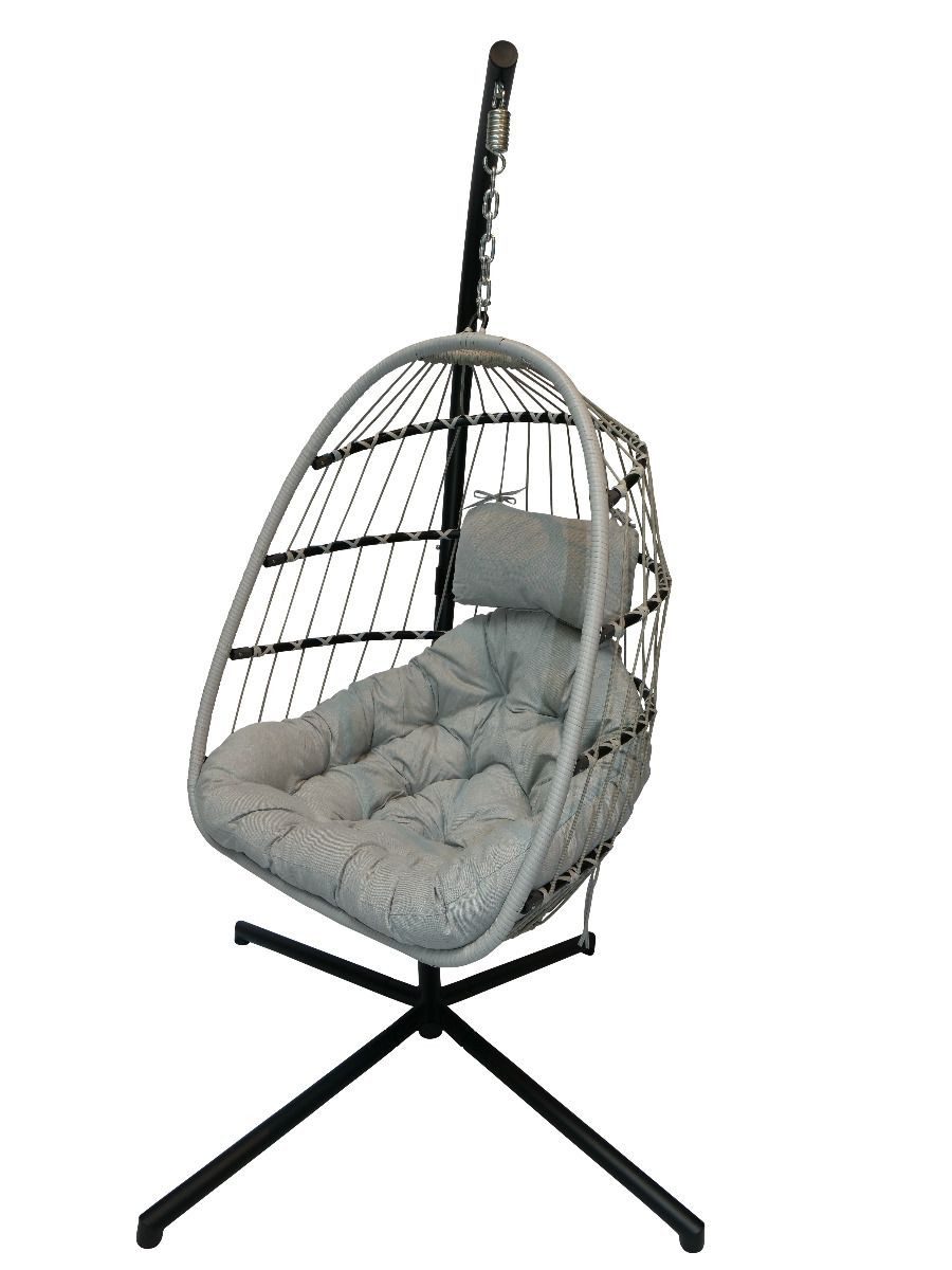 Ein stabiler Hängesessel mit faltbarem Korb aus hochwertigem Rattan-Geflecht. Das pulverbeschichtete Stahlgestell sorgt für Langlebigkeit und Stabilität. Wetterfeste Materialien machen ihn für den Innen- und Außenbereich geeignet. Dank der Klappfunktion lässt sich der Sessel platzsparend verstauen. Die höhenverstellbare Kette des Gartensessels ermöglicht eine flexible Anpassung. Der Hängestuhl ist belastbar bis 130 kg.