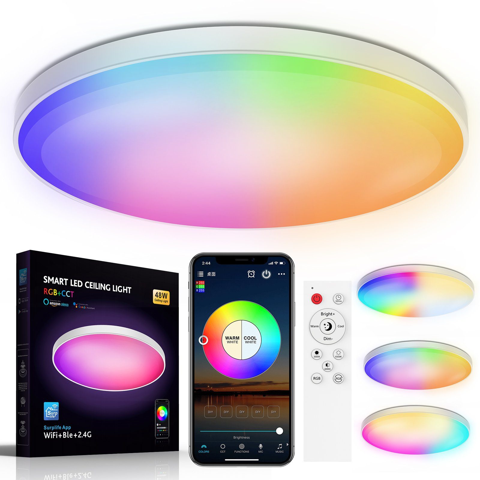 Die intelligente Deckenleuchte mit WiFi- und Bluetooth-Funktion kann mit Amazon Alexa, Google Assistance und IFTTT arbeiten, so dass Sie die LED-Deckenleuchte per Sprache steuern können, um die Farbe zu ändern, die Helligkeit zu dimmen und den Timer einzustellen. Es gibt 16 Millionen Farben (RGB+CCT) für Sie zu wählen. Diese Deckenleuchte ist für Wohnzimmer oder Schlafzimmer. Es ist ein Mikrofon eingebaut, so dass die Lichtfarbe mit der Musik synchronisiert werden kann. 2.4G-Controller und Magic Home APP ermöglichen auch eine Fernsteuerung.