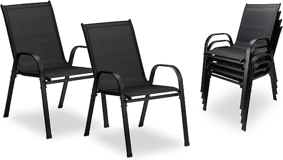 Produktdetails Material Sitzfläche: Atmungsaktives Textilene-Gewebe (schwarz) Material Gestell: Pulverbeschichteter Stahlrahmen Belastbarkeit: Bis zu 120 kg Besonderheiten: Ergonomische Hochlehne, stapelbar, rutschfeste Füße Einsatzbereich: Innen- und Außenbereich Montage: Einfache Selbstmontage