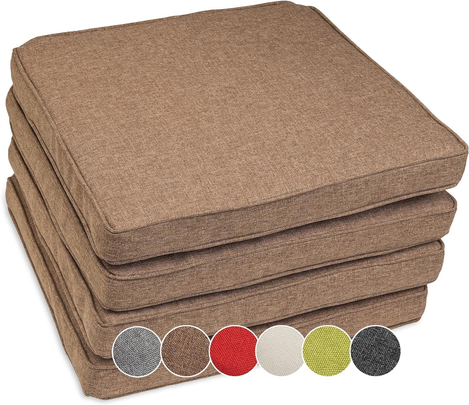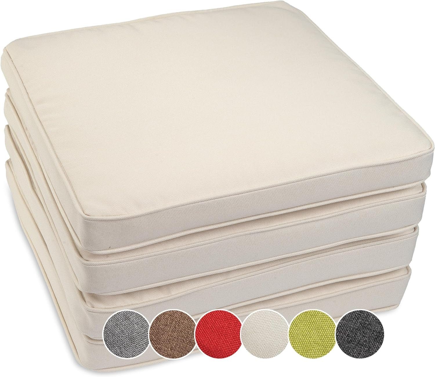 4er SET STUHLKISSEN VON SUNNYPILLOW / MODELL BALI 40x40x5cm / 45x45x5cm / 50x50x5cm - ideal geeignet für Ihre Wohnung, Terrasse oder Ihren Garten! Die bequemen Kissen machen Ihre einfachen Garten- oder Küchenstühle zu Ihrem neuen Lieblingsplatz und verleihen Ihrer Umgebung ein modernes Design. QUALITÄTSVOLLE MATERIALIEN IDEAL FÜR DEN INNEN - UND AUßENBEREICH! Unsere Sitzkissen sind aus robustem, abriebfestem, reißfestem, hautfreundlichem Bezugsstoff - Olefin und aus formstabilem, elastischem Füllmaterial - Kaltschaumstoff (RG 25kg/m3) + Vlieswatte 200g/m2 gefertigt. UV-BESTÄNDIG UND WASSERDICHT Die Kissenbezüge sind aus strapazierfähigem Gewebe gefertigt, das beständig gegen UV- Strahlung ist (UV Beständigkeit: 7/8). Das bedeutet, dass die Farbe unserer Kissen sogar bei Sonnenbestrahlung unverändert bleibt. Zusätzlich ist das Olefingewebe wasserbeständig. Die Auflagen können somit als Outdoor Kissen erfolgreich verwendet werden. HÖCHSTER KOMFORT Die Sitzkissen sind genug dick 5cm, mit Kaltschaum gefüllt, der zusätzlich mit Vlieswatte verstärkt ist, was Verformungen verhindert und für höchsten Sitzkomfort sorgt. Dank der Kaltschaummatratze spürt man den darunter stehenden Stuhl überhaupt nicht. PFLEGELEICHT UND LANGLEBIG Unsere Stuhlkissen sind schmutzabweisend, fleckengeschütz und leicht abwaschbar. Da der Bezug mit einem robusten Reißverschluss ausgestattet ist, kann er leicht abgezogen und bei 30 Grad in der Waschmaschine gewaschen werden. Die Kissen eignen sich somit sehr gut für den täglichen und dauerhaften Gebrauch.