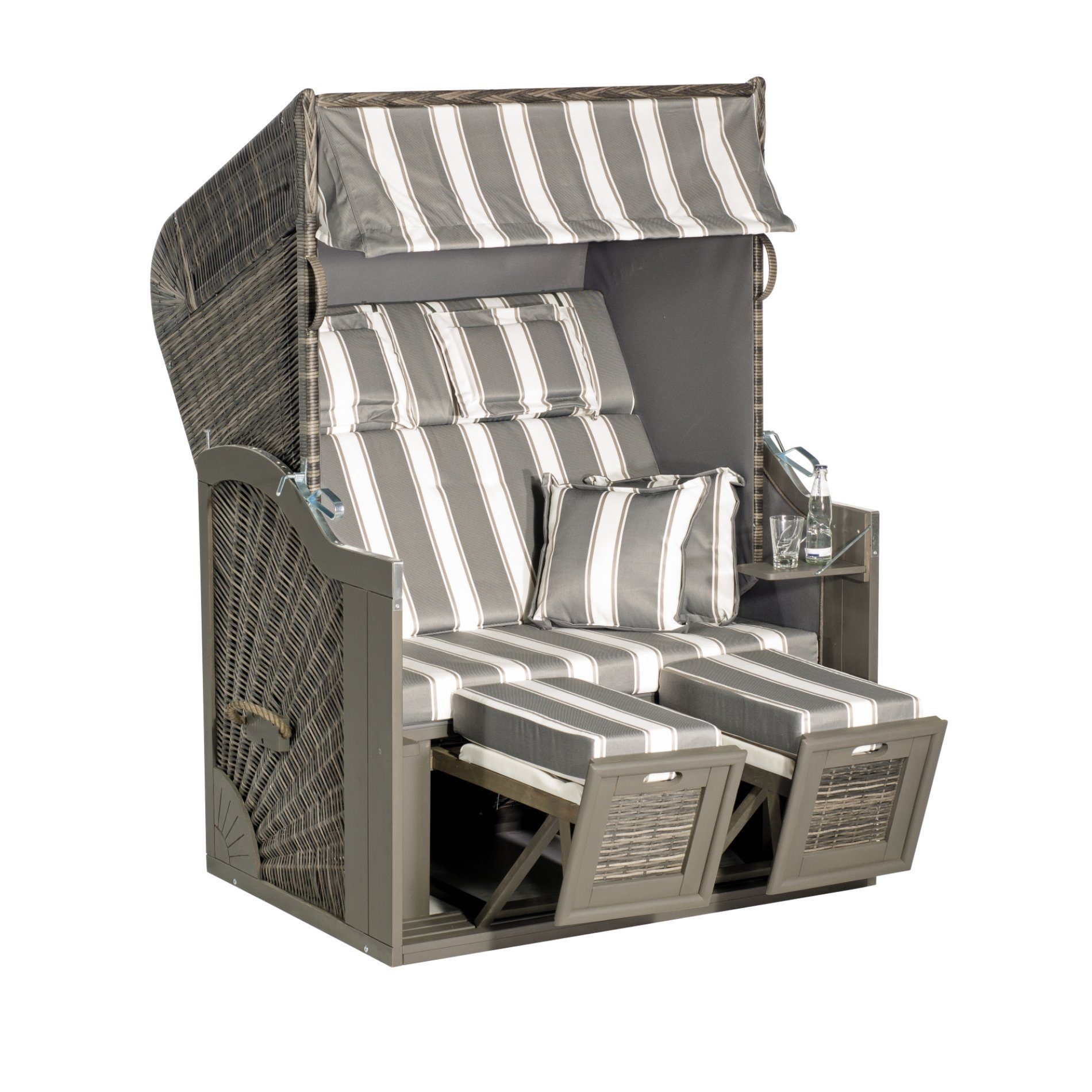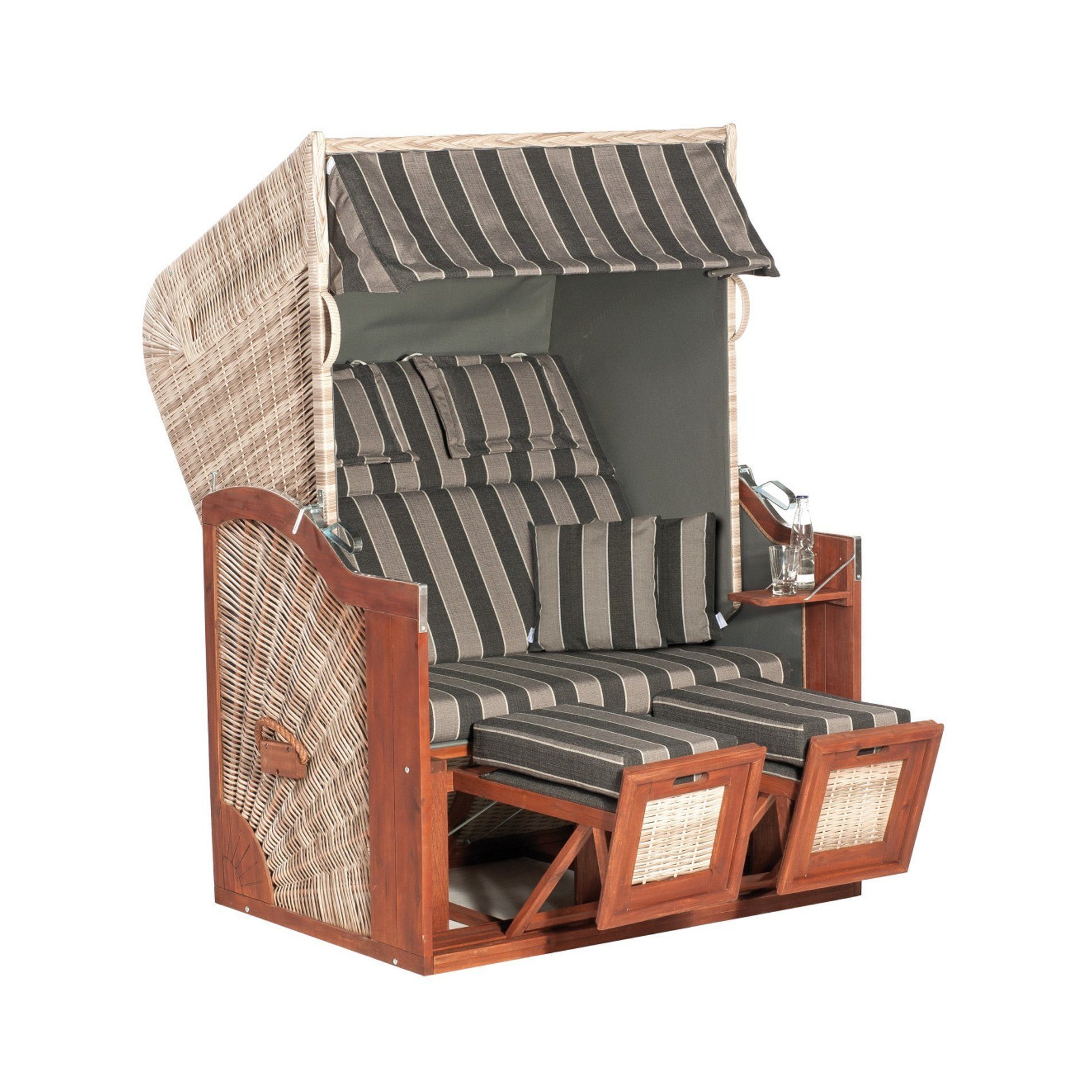 Der Korpus des Strandkorbs besteht aus robustem Akazienholz, umwoben mit einem langlebigen Kunststoffgeflecht. Die herausnehmbare Kissengarnitur (Sitz-, Rücken- und Fußstützenpolster) besteht aus 100% Polyester und ist mit komfortablem Möbelschaumstoff gefüllt. Der Bezug der Polster ist identisch mit dem Stoff der Sonnenmarkise und sorgt so für ein harmonisches Gesamtbild.