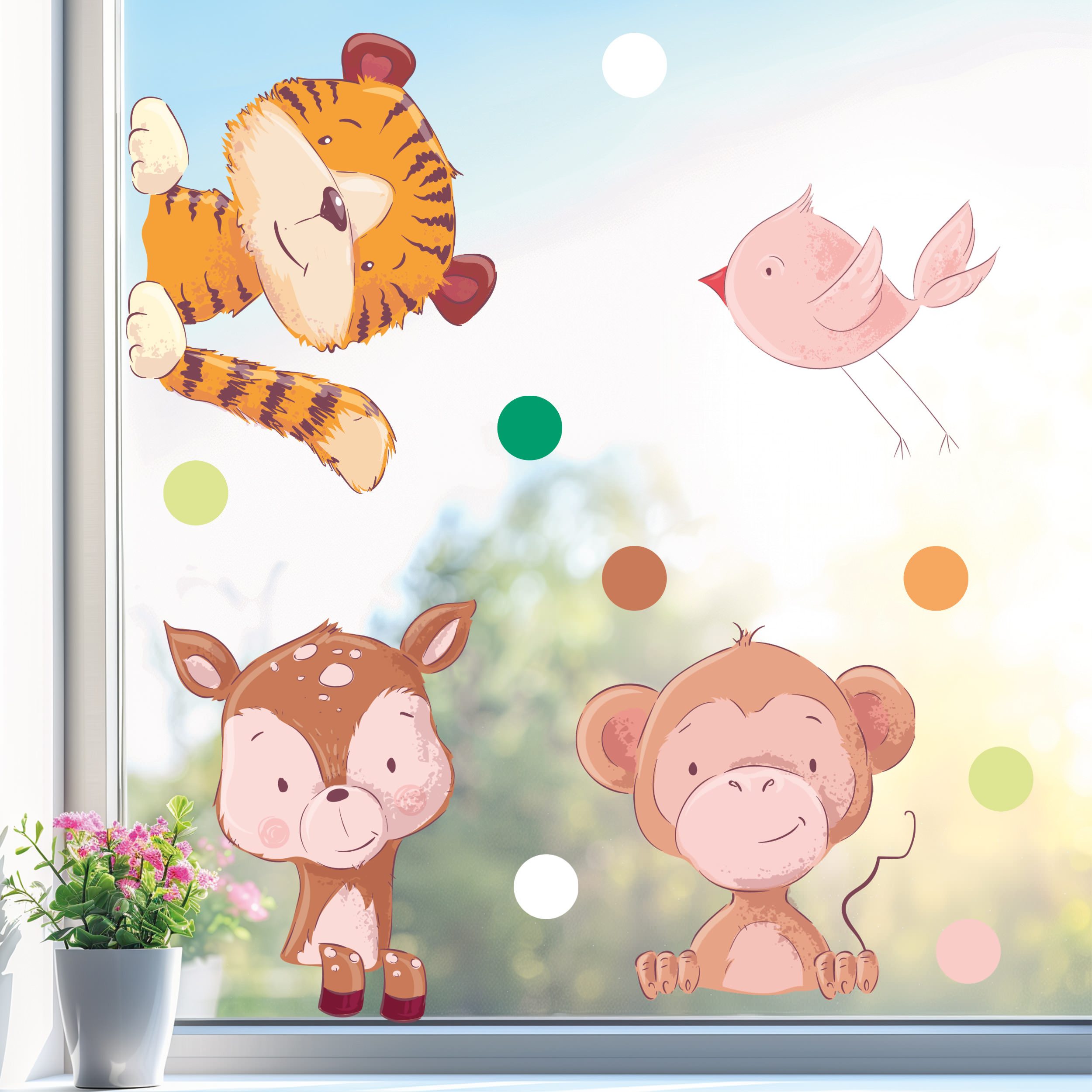 Erwecken Sie mit unserem Fensterbild "Zauber des Dschungels" die Fantasie Ihrer Kinder. Ein Tiger, der verspielt seine Tatzen ausstreckt, ein rosafarbenes Vögelchen, das sanft durch die Luft schwebt, ein freundliches Rehkitz, das mit großen Augen die Welt entdeckt, und ein lächelnder Affe, der zum Spaß einlädt – sie alle fangen die unbeschwerte Freude und das Abenteuer des Dschungels ein. Umrahmt von einem Meer aus bunten Punkten und neben einem Topf voll blühender Pflanzen, zaubert dieses Fensterbild eine lebendige und inspirierende Szene in jedes Zimmer. Unser Fensterbild ist aus hochwertigem Material gefertigt und lässt sich mühelos auf glatten Oberflächen wie Fenstern oder Spiegeln anbringen. Es haftet ohne Klebstoff und hinterlässt keine Rückstände, was eine einfache Anbringung und Entfernung ermöglicht. Die klaren Farben und die detailreiche Gestaltung machen dieses Bild zu einem Blickfang, der das Auge erfreut. Mit einer Размер von A2, A3 oder A4 passt das Fensterbild perfekt in verschiedene Wohnbereiche wie Wohnzimmer, Schlafzimmer oder Kinderzimmer. Es ist eine großartige Möglichkeit, Ihren persönlichen Stil zu zeigen und Ihre Räume mit einer verspielten Note zu gestalten. Entdecken Sie die Magie der Natur mit unserem Fensterbild und bringen Sie Frische und Lebensfreude in Ihr Zuhause!