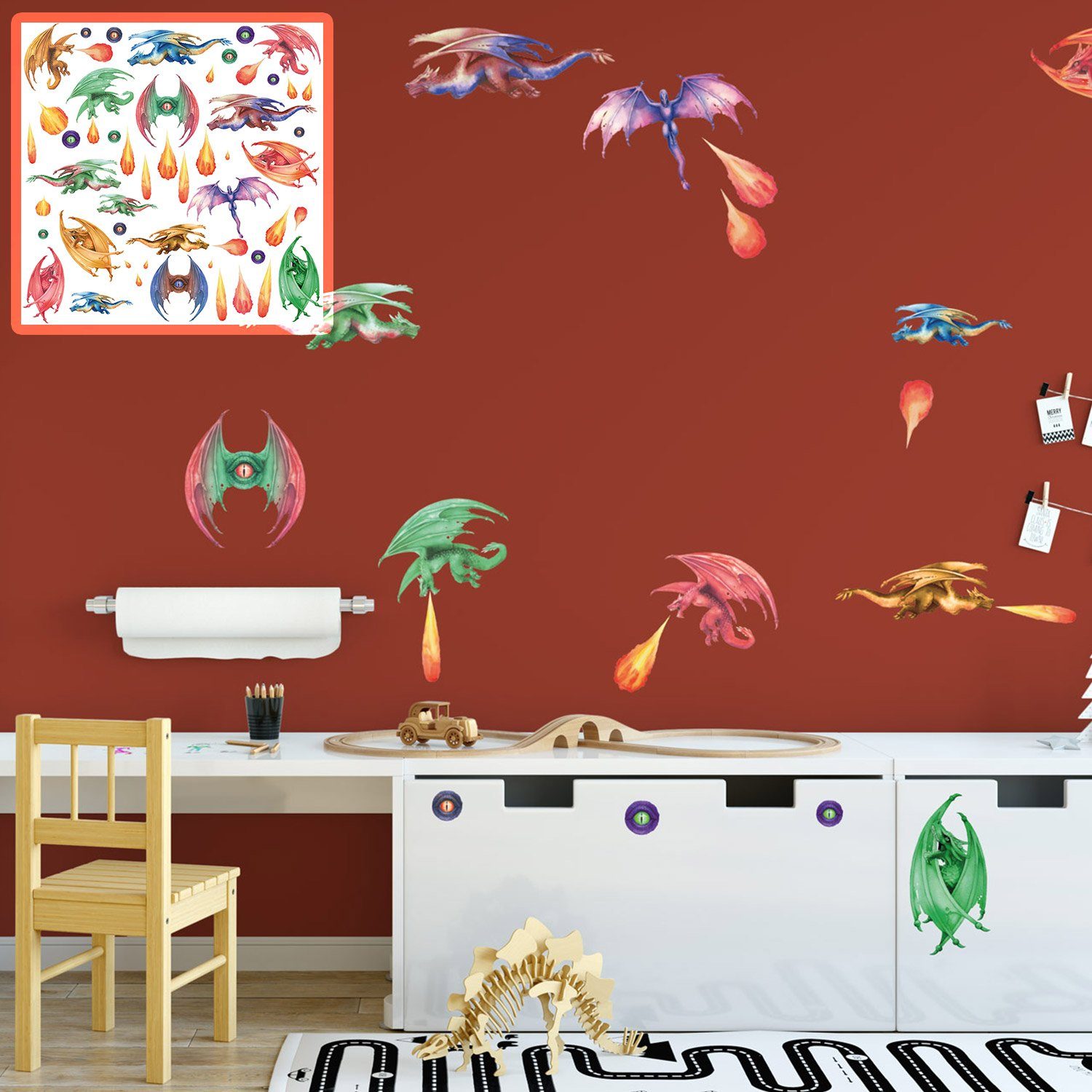 Für eine Einzelübersicht der Größen schauen Sie auf unser Detailproduktbild. Dort gibt es eine Linealansicht des Bogens. XXL Drachen Aufkleberset zur farbenfrohen Dekoration von kompletten Wänden. Maßangaben siehe Produktbild - Skizzentabelle. Für verspielte Erwachsene oder glückliche Kinder bieten unsere Sets für jeden Individualisten die perfekte Traumwelt. Mit einem Set lässt sich problemlos eine ganze Wand dekorieren. BOGENGRÖSSE: 126 CM x 105 CM - Wandtattoos von Sunnywall kleben Sie auf Ihre Wände oder Möbel als Dekoration. Sie besteht aus einer hauchdünnen Folie und wirkt am Ende wie professionell aufgemalt. QUALITÄT - Seidenmatt, stilecht mit KRÄFTIGEN & SATTEN FARBEN - Dank moderner Produkttechnolgie ALLESKÖNNER Für viele Untergründe im Inneneinsatz geeignet: u.a. für Tapeten | Raufaser | Feinputz | Fliesen | Glas | Metall | Holz und Kunststoff. Fast Grenzenlose Einsatzmöglichkeiten. KONTURGESCHNITTENES MOTIV - Ohne unschöne transparente Ränder. Nahezu lebenslang haltbar im Innenbereich nach der Verklebung. BPA Frei (kein Bisphenol A Schadstoff). SELBSTKLEBEND Rückstandslos entfernbar und geliefert mit Gebrauchsanweisung | Motiv konturgestanzt - freistehend ohne Hintergrund. Hergestellt in Deutschland nach Qualitätsstandard zu fairen Löhnen in unserer Manufaktur in Berlin-Karlshorst. Allgemeine Hinweise für die Verklebung von Wandtattoo/Wandaufklebern achte darauf, dass die Wandfläche sauber, trocken, fettfrei und staubfrei ist ungeeignet sind Wände, die mit Latexfarben oder silikonhaltigen Farben gestrichen wurden weniger geeignet sind ebenfalls sehr grobe Raufasertapeten, starke Struktur- und Velourtapeten. beachte weiter, dass Sie die Wandtattoo`s nicht auf frisch gestrichenen oder vor kurzem gestrichenen Wänden bzw. tapezierten Wänden anbringen sollten. (Das vollständige Eintrocknen der Farbe bzw. des Tapetenklebers kann bis zu einem Monat dauern. Es ist daher zu empfehlen, diesen Zeitraum abzuwarten, bevor Sie das Tattoo bringen.)