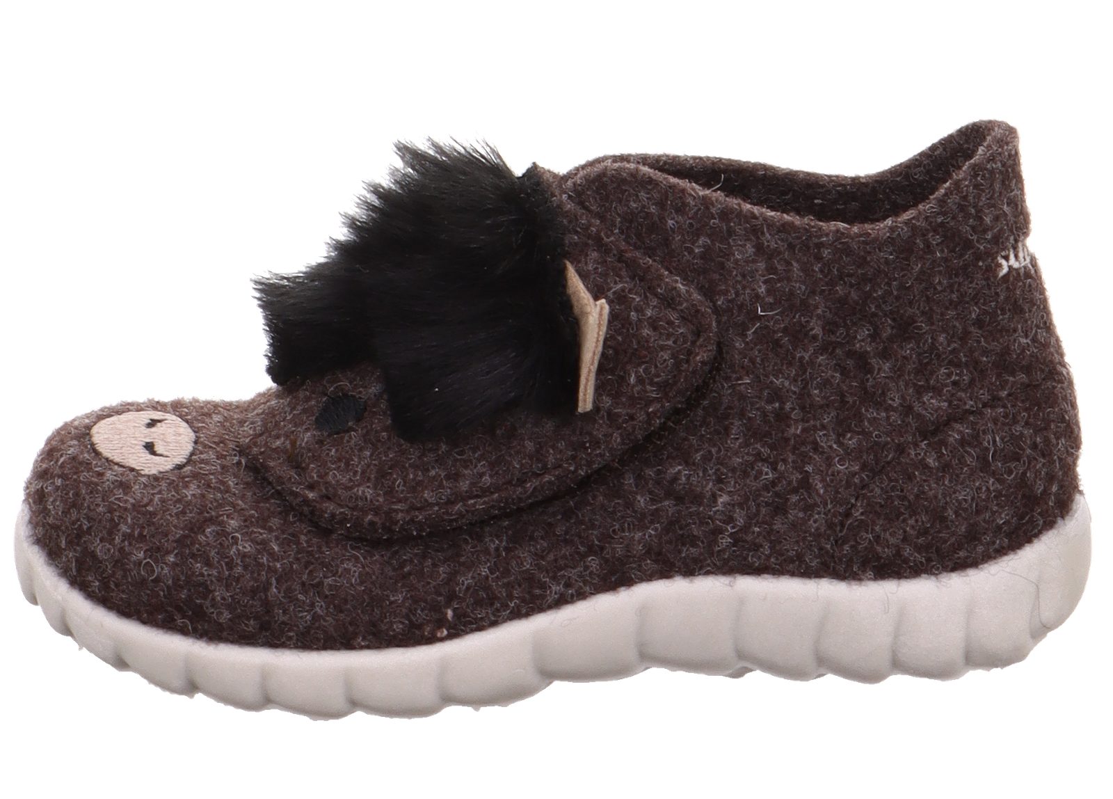Ein kuscheliger Jungen Hausschuh mit süßer Applikation. Das Obermaterial wurde aus wärmenden Wollfilz gearbeitet. Ein Klettverschluss sorgt für einen einfachen und schnellen Einstieg. In der Weite M-mittel gearbeitet. Der angenehm breite Vorderschuh bietet viel Zehenfreiheit und Bequemlichkeit. Die innen verlängerte Fersenkappe bietet einen sicheren Halt. Ausgestattet mit einer rutschfesten, superleichten, äußerst biegsamen und nicht abfärbenden Laufsohle mit Klimaporen, diese sorgen für ein prima Fußklima. Ein putziger Jungen Hausschuh, für die Kleinen nur das aller Beste.