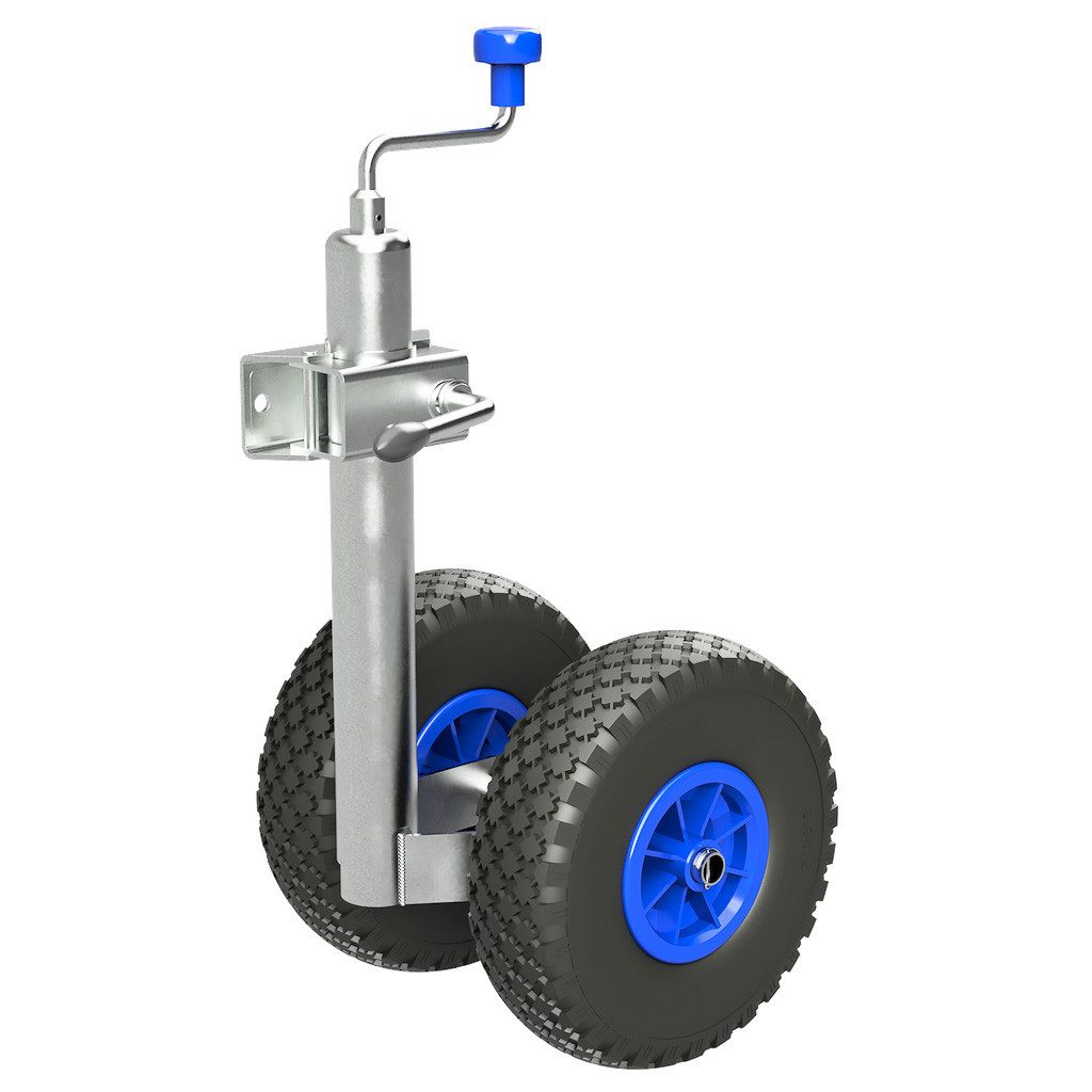 Ein sicheres Abstützen des Anhängers ist mit diesem Zwillingsstützrad möglich. Zwei Lufträder mit einer Reifenbreite von je 85 mm verhindert ein Einsinken auf weichem Untergrund. Das Doppelstützrad ist universell für alle gängigen Anhänger geeignet.
