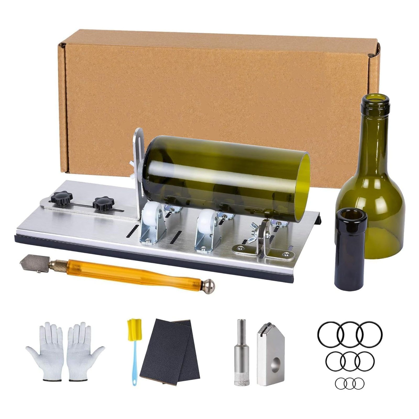 Lieferumfang | 1 Glasflaschenschneider 2 Schleifpapiere 9 Gummiringe 1 Locher 1 Paar Handschuhe 1 Bürste |