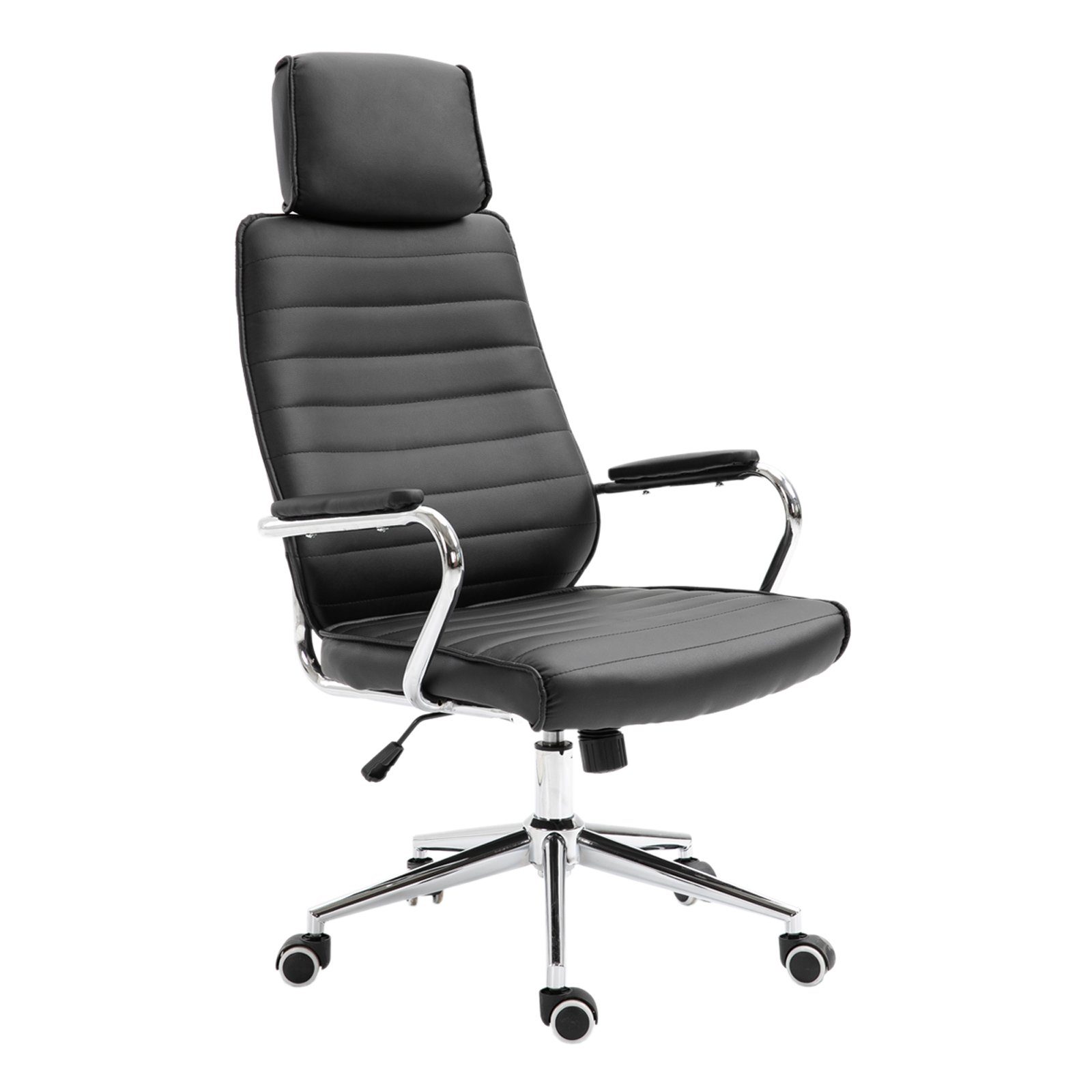 Der bequeme Bürostuhl ist mit praktischer Kopflehne und ergonomischer Rückenlehne ausgestattet. Sie können die Sitzhöhe stufenlos verstellen und dank der bodenschonende Kunststoffrollen auf vielen Bodenbelägen ohne Probleme rollen. Der Drehstuhl ist in einem zeitlosen Stil und passt sich jedem Arbeitszimmer und Büro an.