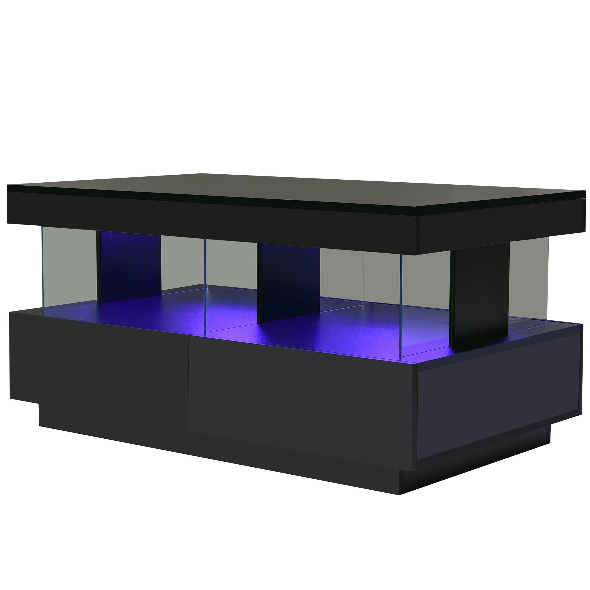 Der Hochglanz-Couchtisch mit farbwechselnden LED-Lichtern und Fernbedienung ist das perfekte Möbelstück, um Ihrem Wohnzimmer Eleganz zu verleihen. Das moderne Design und die praktischen Funktionen machen ihn zu einem Blickfang und gleichzeitig sehr funktional. Die mehrfarbige LED-Beleuchtung ermöglicht es Ihnen, die Atmosphäre Ihres Zimmers ganz nach Ihrem Geschmack zu gestalten. Farbe und Helligkeit lassen sich ganz einfach mit der mitgelieferten Fernbedienung steuern. Sie können eine entspannende Umgebung schaffen oder leuchtende Farben für besondere Anlässe wählen. Dieser elegante Couchtisch besteht aus einem robusten Spanplattenrahmen, der für Langlebigkeit sorgt. Der Couchtisch wird mit zwei großen Schubladen geliefert, in denen Sie Bücher, Zeitschriften, Fernbedienungen und andere Gegenstände ordentlich aufbewahren können. Die Schubladen lassen sich leicht öffnen und schließen, was sie zu einer praktischen Aufbewahrungslösung macht. Der Stauraum in der Mitte des Couchtisches ist durch drei Glasplatten abgetrennt. Dieser Bereich eignet sich hervorragend für dekorative Gegenstände wie Vasen, Figuren oder Erinnerungsstücke. Die hochglänzende Tischplatte rundet das elegante Design ab und verleiht Ihrem Wohnzimmer einen modernen Touch. Die Tischplatte lässt sich mühelos reinigen. Flecken und Schmutz lassen sich leicht mit einem feuchten Tuch oder einem milden Reinigungsmittel entfernen, so dass der Tisch wie neu aussieht. Mit unserer klaren Montageanleitung kann jeder diesen Beistelltisch leicht zusammenbauen. Все Teile und Montageanleitungen sind im Lieferumfang enthalten. Da die Produkte alle von Hand gemessen werden, kann es 1-2cm Fehler geben. Um das Risiko von Versandverlusten zu verringern, werden die Produkte in 2 Paketen verschickt und kommen möglicherweise nicht zur gleichen Zeit an. Aus Gründen der Transportsicherheit sind im Lieferumfang der Fernbedienung keine Batterien enthalten; das Batteriemodell lautet: CR2025.