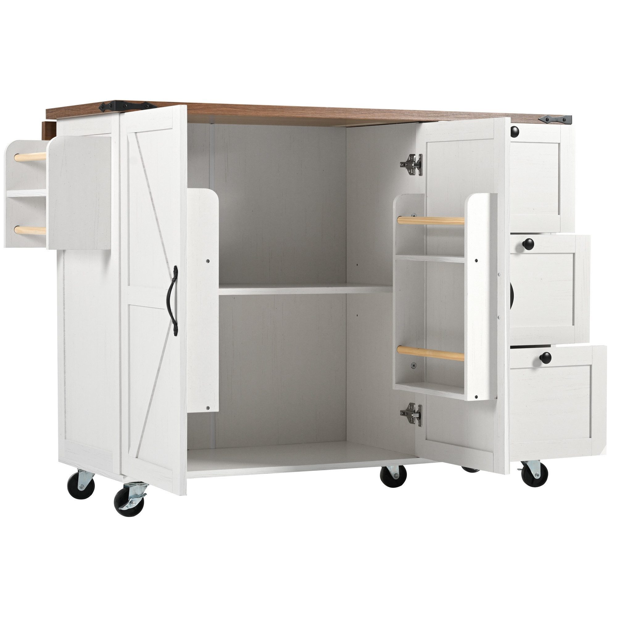 Diese Kücheninsel bietet Ihnen eine großzügige Arbeitsplatte, zusätzliche Gewürzregale, offene Regale und Schränke mit Türen. Darüber hinaus verfügt der Servierwagen über eine geräumige Schublade zur Aufbewahrung von Geschirr. Bemerkenswert ist auch die ausziehbare Arbeitsplatte, mit der Sie zusätzlichen Platz schaffen oder bei Bedarf zusammenklappen können.