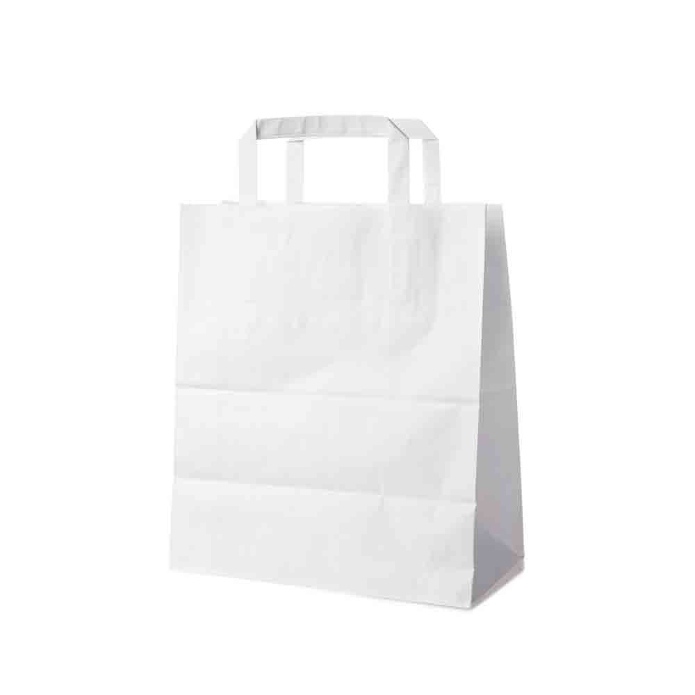 Die weißen Papiertragetaschen mit den Maßen 22 + 10 x 28 cm sind die nachhaltige und praktische Alternative zu Plastiktüten. Aus stabilem 70 g/m² Kraftpapier gefertigt, sind die Taschen langlebig, robust und bis ca. 10 kg belastbar.