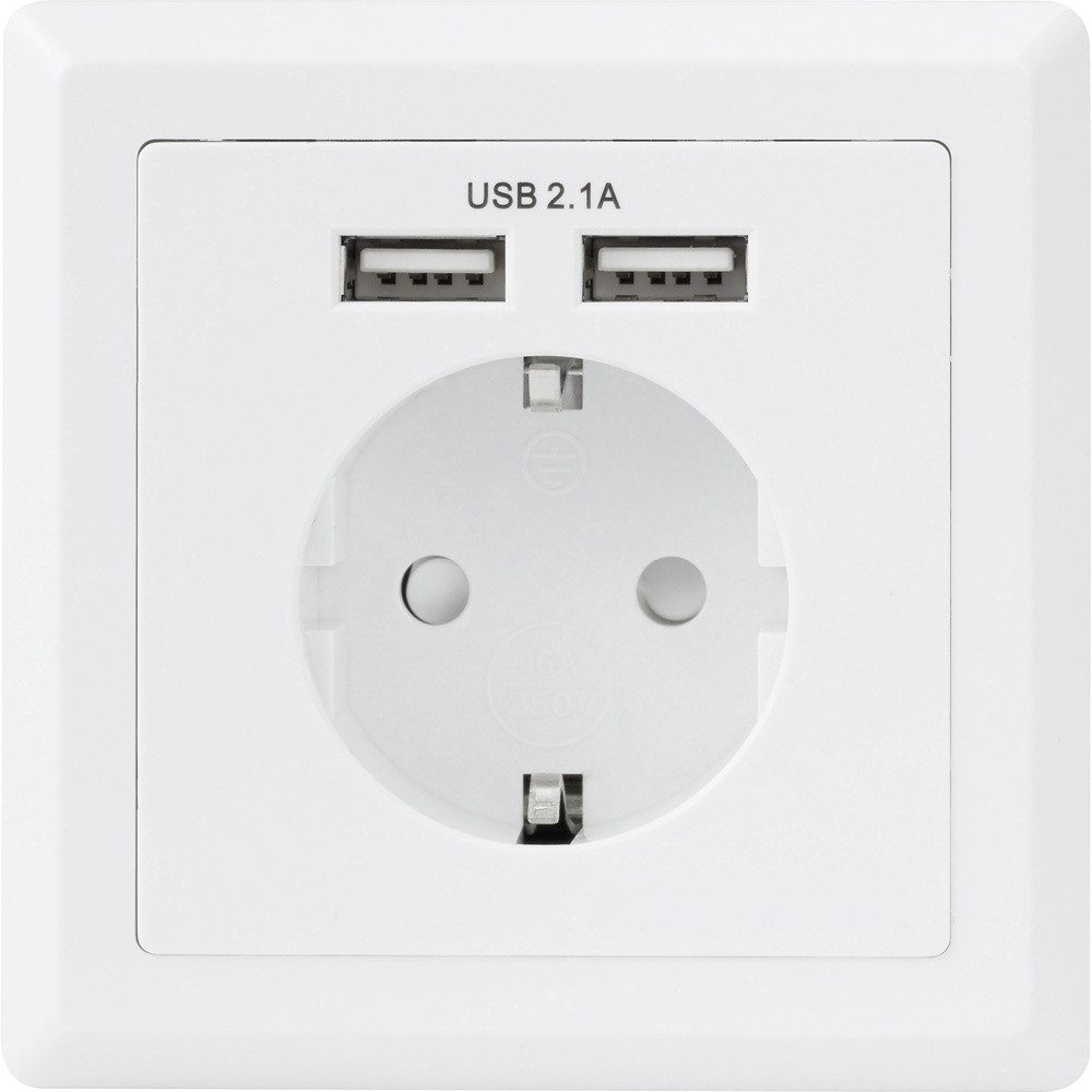 Unterputzsteckdose mit zwei separaten USB-Ladesteckdosen. Über die USB-Ladesteckdose können Sie Smartphones, Tablets oder MP3 Player laden und die Steckdose bleibt weiterhin nutzbar. Gesamt-Anschlussleistung für beide USB-Ladebuchsen 5 V/ 2,1 A