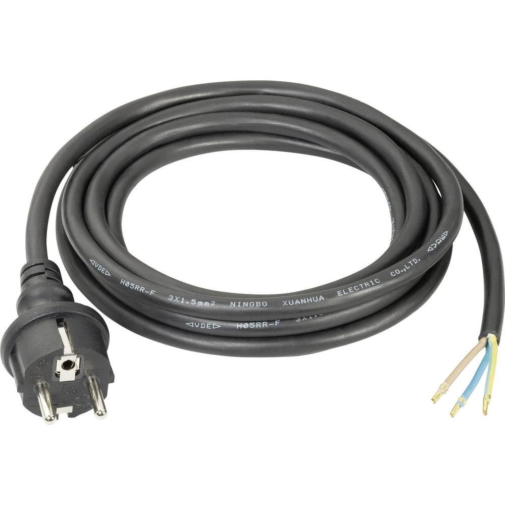 Eigenschaften | Anschlusstyp A (bzw. Eingänge): Schutzkontakt-Stecker · Anschlusstyp B (bzw. Ausgänge): offene Kabelenden · Herstellerfarbe: Schwarz · Kabel-Anwendung: Strom · Kabel-Ausführung: Anschlusskabel · Kabel-Typ nach DIN/VDE: H05RR-F 3G 1,5 mm² · Kabellänge: 3.00 m · Plastikfreie Verpackung: Plastikfreie Verpackung · Steckerausführung: gerade |