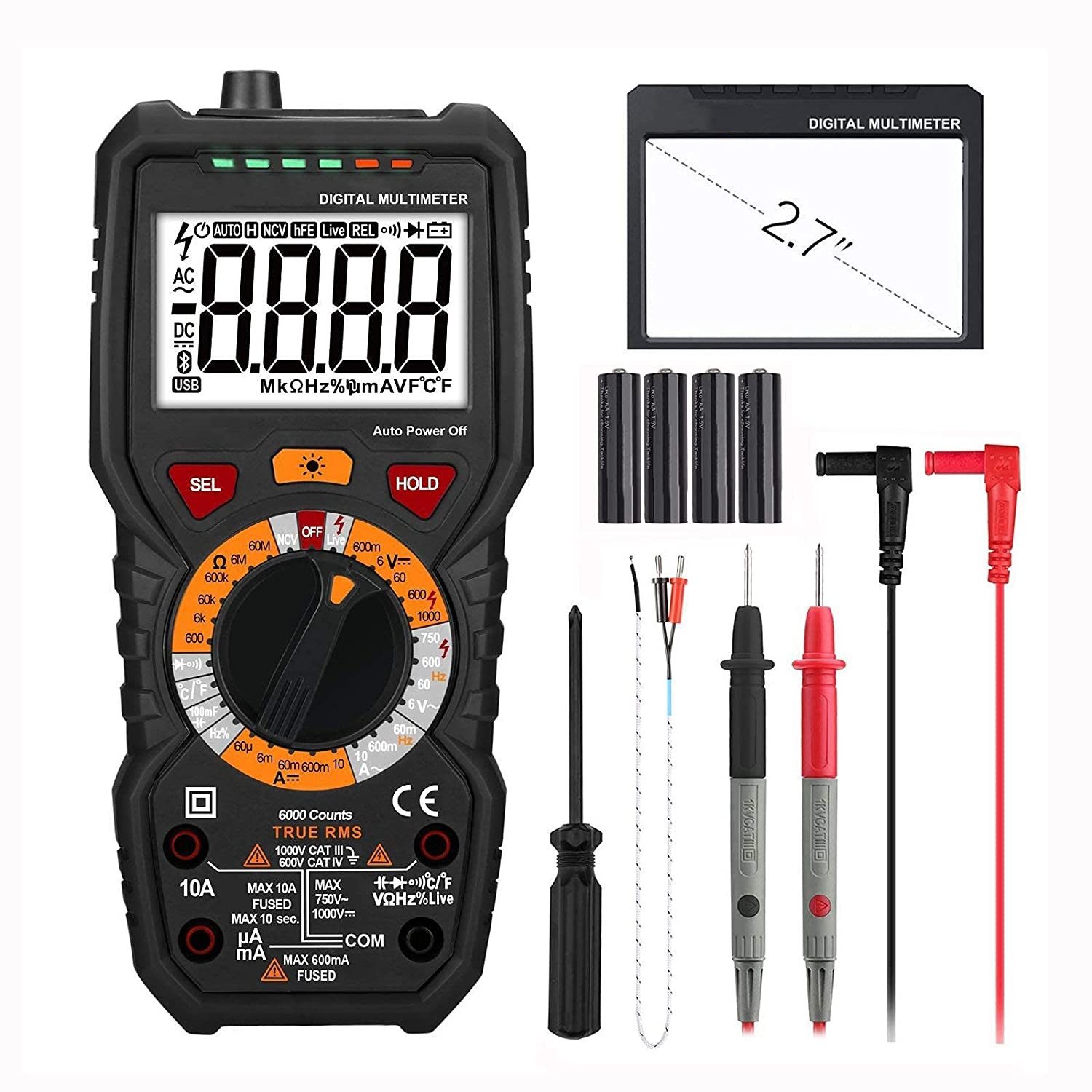 6000Counts Display. Wahrer gültiger Wert. Mit diesem Multimeter können Sie bis zu 1000V Gleichspannung, bis zu 750V Wechselspannung, bis zu 10A AC/DC Strom, bis zu 60M ω Widerstand, bis zu 100mF Kapazität, 600V CAT IV, 1000V CAT III messen. Doppelsicherung, 100% sicher.