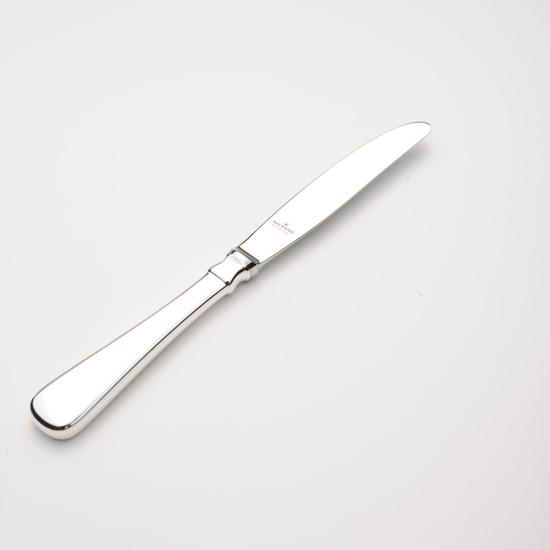 Wilkens Menümesser Messer Spaten in 925 Sterlingsilber Edles Menümesser von WILKENS in Sterlingsilber - Muster Spaten. Ergänzen Sie weitere Besteckteile für eine stilvoll gedeckte Tafel! Auf Wunsch mit WILKENS Meister Gravur (aufpreispflichtig). Diesem Entwurf ist kaum anzusehen, daß er auf das erste Drittel des 19. Jahrhunderts zurückgeht: WILKENS Spaten. Sein markanter Umriß, seine klare, glatten Flächen begeistern Liebhaber von Tafelsilber seit mehr als sechs Generationen. Der Übergang zur Laffe markiert von je zwei Ohren, die den harmonischen Besteckentwurf aus dem Biedermeier abrunden. Auf Hochglanz polierte Besteckstiele, die zum Ende hin breit auslaufen und ausreichend Platz für das Gravieren eines Monogramm lassen. Die tägliche Nutzung Ihres WILKENS Silberbesteck verhindert ein Anlaufen (oxidieren) der Besteckteile. WILKENS Silber- und versilberte Bestecke dürfen gerne im Geschirrspüler gereinigt werden. Für die besondere Silberpflege empfehlen wir die Pflegeprodukte aus dem Pflegemittelsortiment von Hagerty. So bewahren Sie den Glanz und die Freude an Ihrem WILKENS Tafelsilber - Tag für Tag.