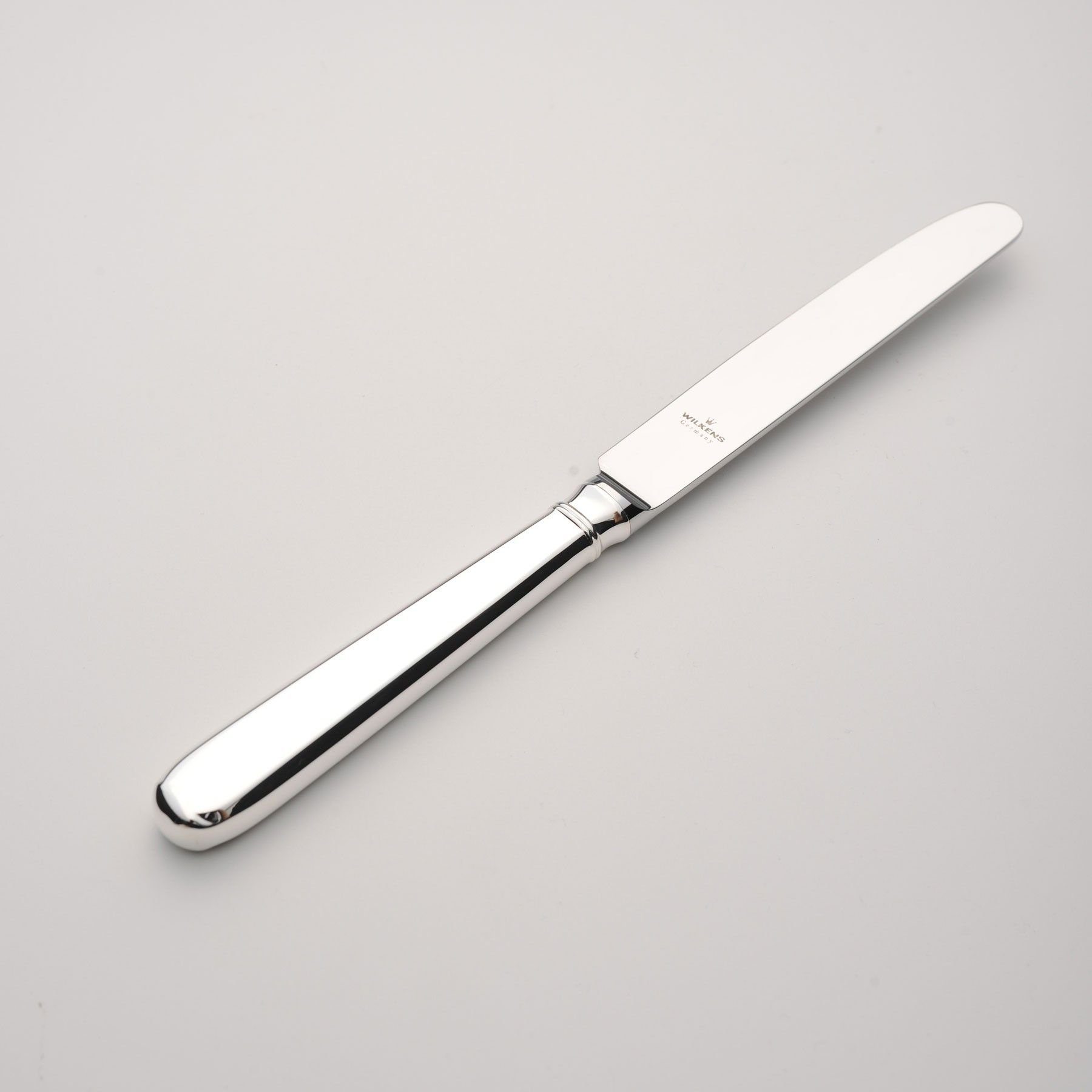 Wilkens Menümesser Messer Gala in 180g Royal Versilberung Edles Menümesser von WILKENS in Royal Versilberung - Muster Gala. Ergänzen Sie weitere Besteckteile für eine stilvoll gedeckte Tafel! Auf Wunsch mit WILKENS Meister Gravur (aufpreispflichtig). ""Noblesse oblige"" könnte über diesem Entwurf stehen, der Lebensfreude auf höchstem Niveau ausdrückt: WILKENS Gala. Die juwelenhaft facettierte Kontur, der fein modellierte ""Doppelring"" und das ausdrucksvolle Revers-Ornament wirken zur Steigerung gehobener Tafelfreuden zusammen. Design: Walter Storr, 1993. Die tägliche Nutzung Ihres WILKENS Silberbesteck verhindert ein Anlaufen (oxidieren) der Besteckteile. WILKENS Silberbestecke dürfen gerne im Geschirrspüler gereinigt werden. Für die besondere Silberpflege empfehlen wir die Pflegeprodukte aus dem Pflegemittelsortiment von Hagerty. So bewahren Sie den Glanz und die Freude an Ihrem WILKENS Tafelsilber.