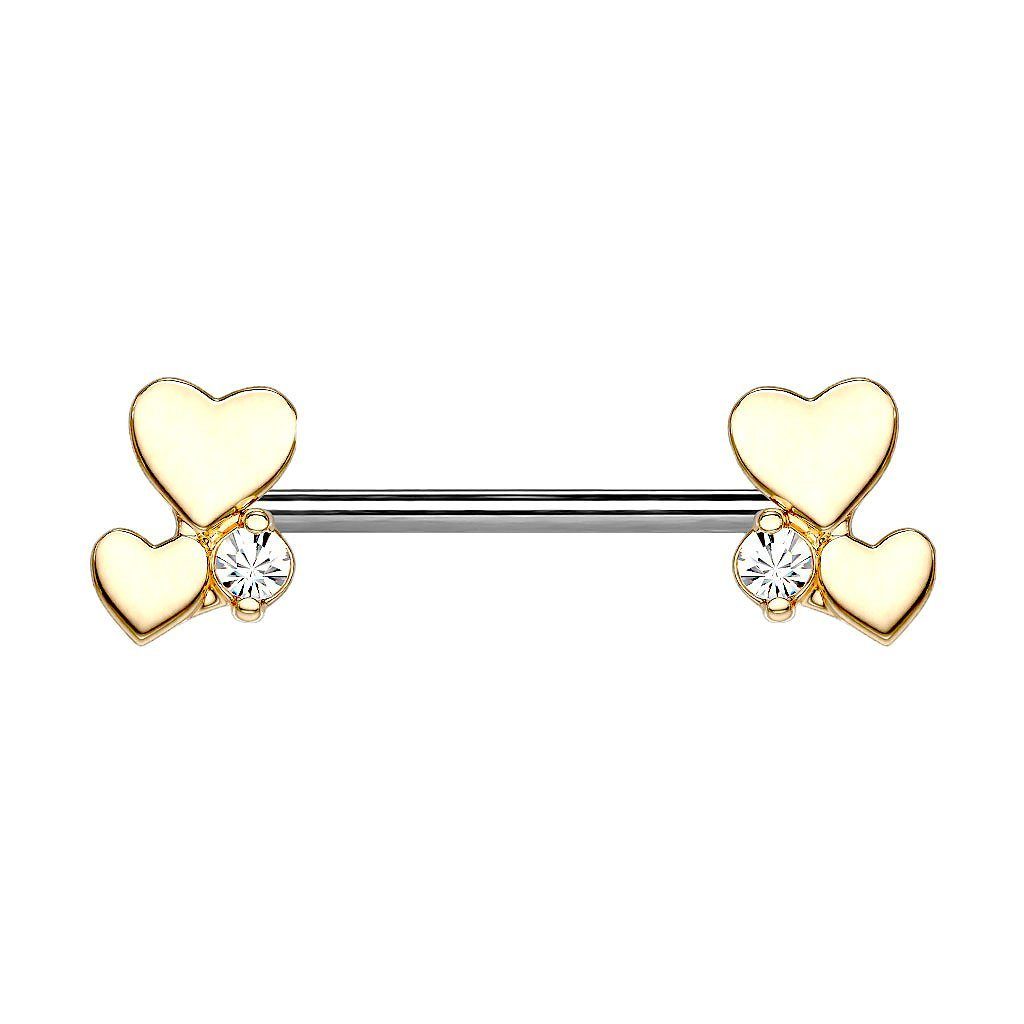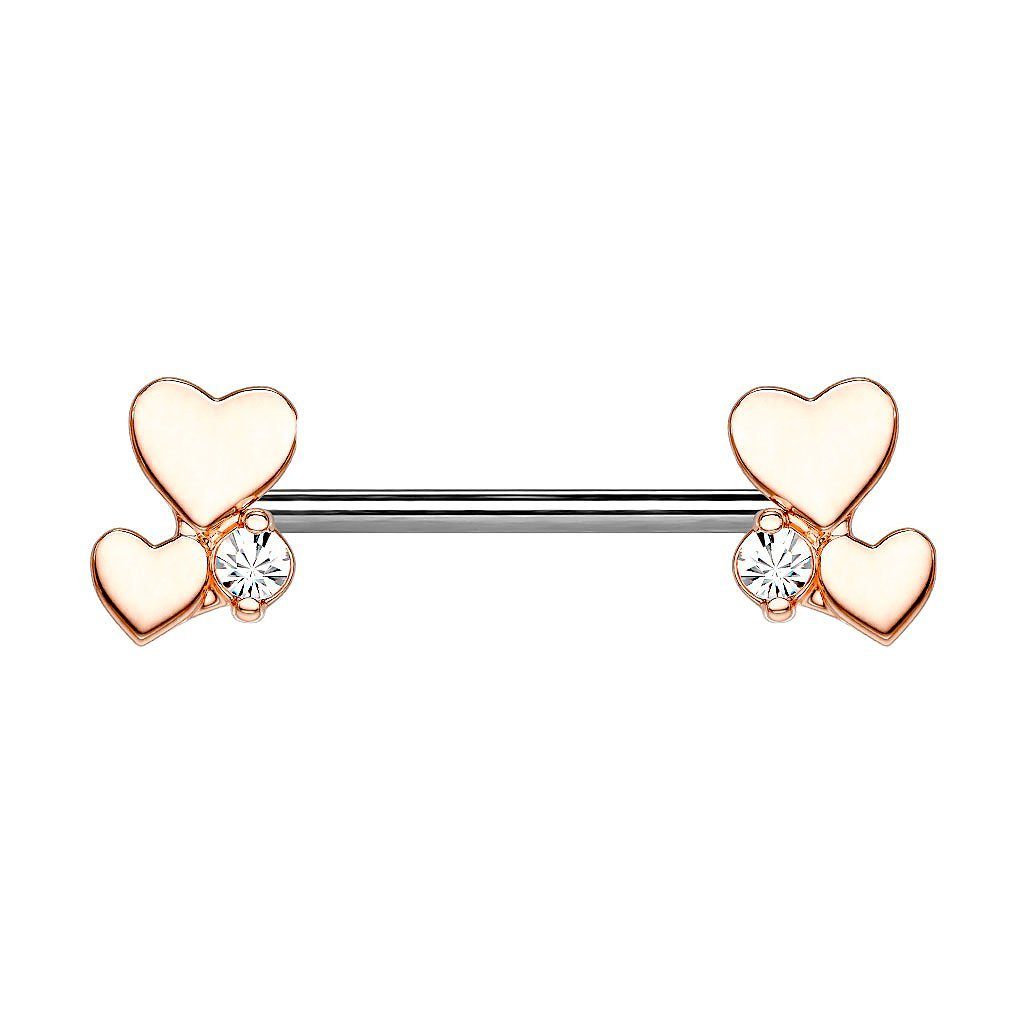Beschreibung: Dieses Brustwarzenpiercing ist mit zwei kleinen Herzen und einem Kristall Stein an jedem Ende des Barbells verziert. Eine Seite der Herzen lässt sich abschrauben um Dein Piercing einzusetzen.