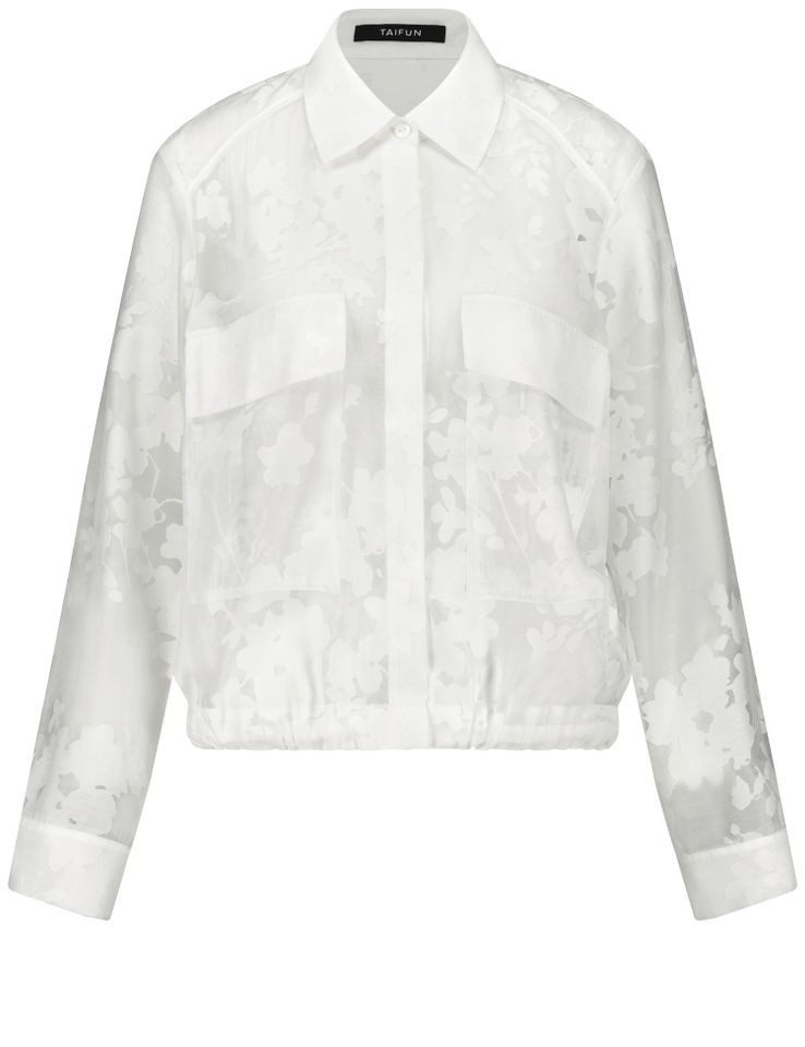 Leichte Blusenjacke von Taifun mit floraler Transparenz, Hemdkragen und verstellbarem Saum. Ideal für modische Layering-Looks.