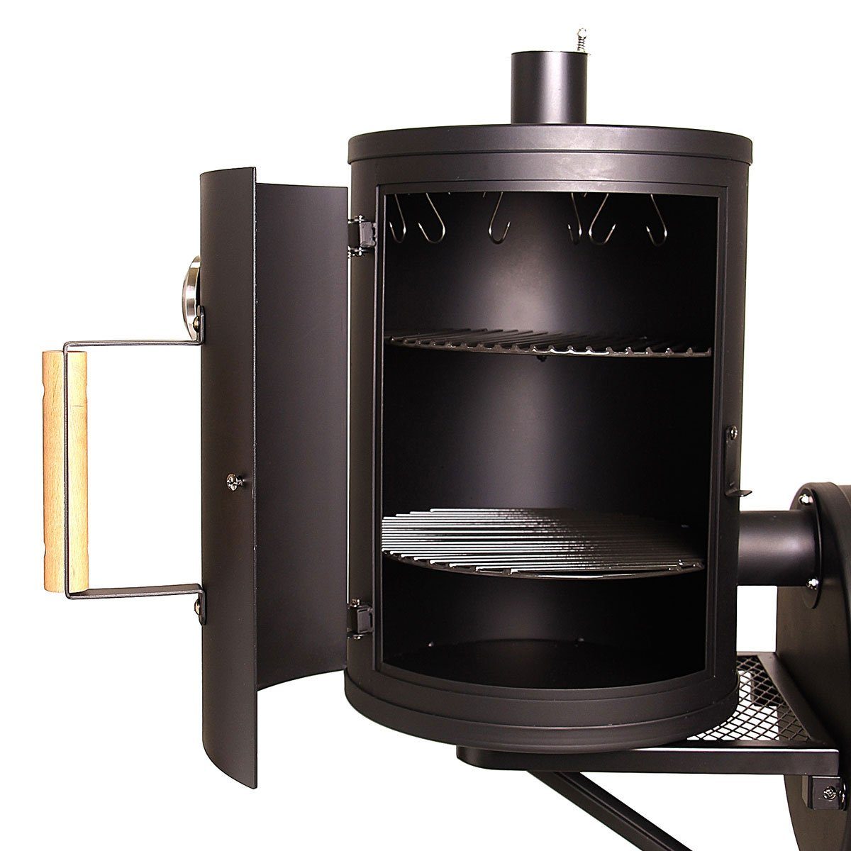Ausstattung | Thermometer 2 Roste Räucherhaken Tür mit Holzgriff Schornstein für ideale Luftzirkulation |