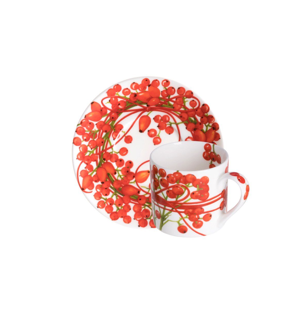 Taitù Fil Rouge Bacche - Espressotasse m/U Taitù Fil Rouge Bacche feiert die Farbe Rot! Detailreich gestaltete Früchten von Vogelbeere und Heckenrose zieren die verschiedenen Geschirrteile von Fil Rouge Bacche. Auch bei dieser Serie schlängelt sich ein roter Faden durchs Dekor. Designerin: Silvia Cabassa