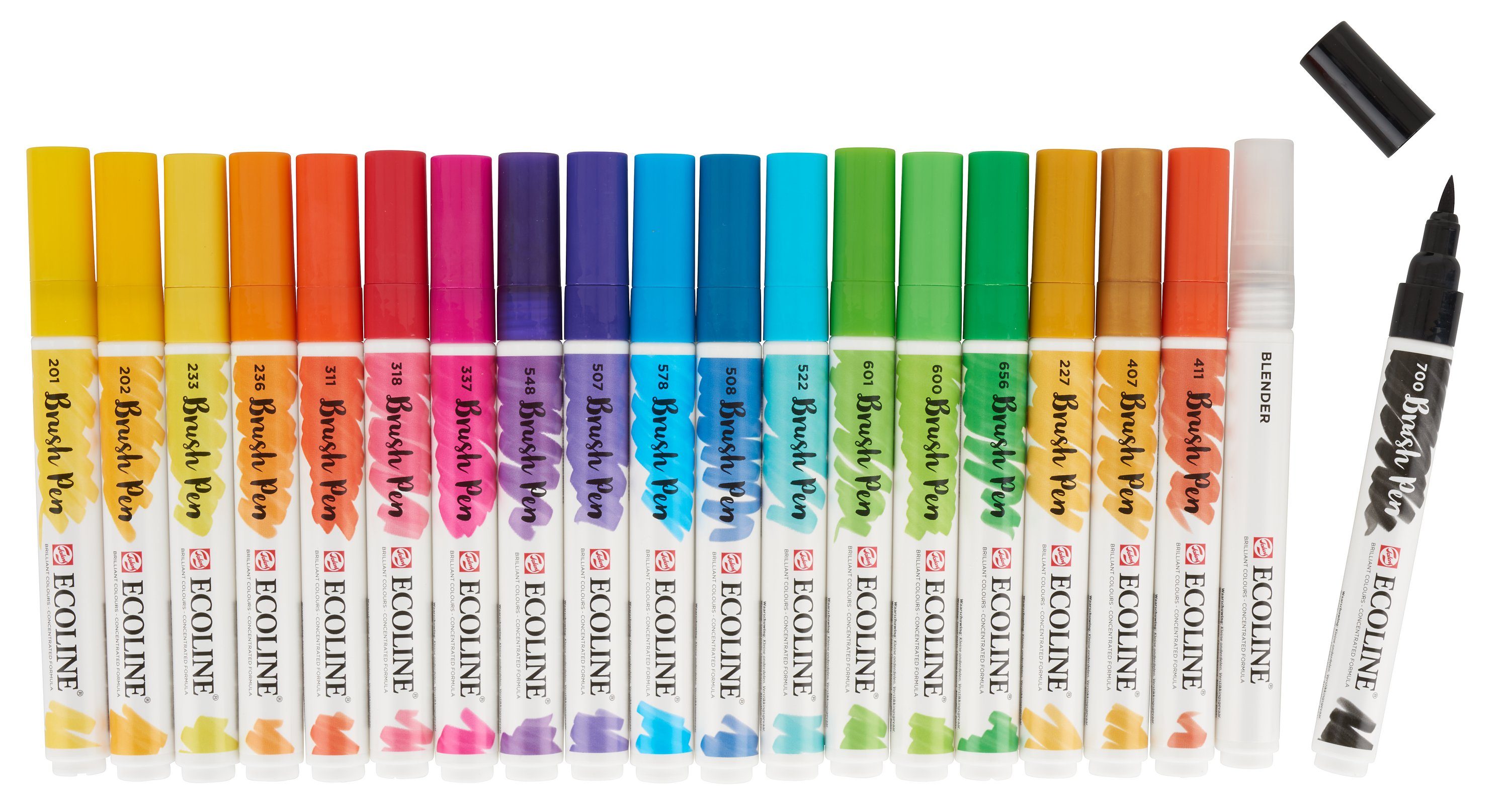 Praktisches Talens Ecoline Brush Pen Set mit 19 brillanten Farben und einem Blender. Die Brush Pens sind sofort Einsatzbereit und perfekt für Unterwegs. Die konzentrierte Rezeptur garantiert einen nahtlosen Übergang mit Talens Ecoline aus dem Fläschchen. Die besten Resultate erhält man, wenn auf hellem oder weißem Papier gezeichnet wird. Bereits getrockneten Farben können mit Wasser befeuchtet werden, so ist es möglich jederzeit mit der Zeichnung fortzufahren. Für einen optimalen Farberhalt, sollten die Werkstücke in einer Zeichenmappe aufbewahrt werden.