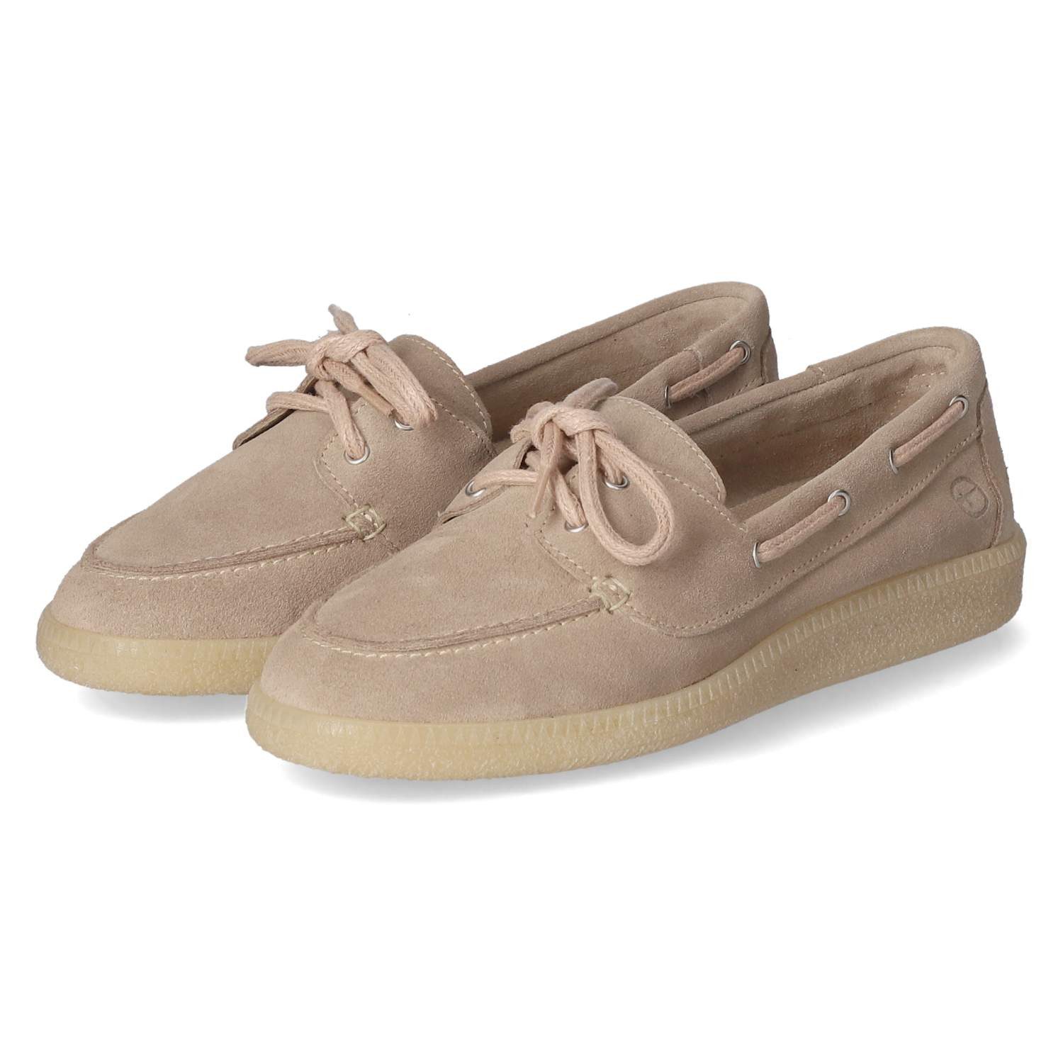 Die Tamaris Damen Slipper/Bootsschuhe in Taupe aus hochwertigem Rauleder überzeugen mit einem zeitlosen Design und hohem Tragekomfort. Feine Markendetails und eine dezente Wulstnaht verleihen dem Schuh eine elegante Optik. Die Schnürung ermöglicht eine individuelle Anpassung, während die verstärkte Ferse für zusätzliche Stabilität sorgt. Das gepolsterte Wechselfußbett gewährleistet optimalen Komfort und kann bei Bedarf ausgetauscht werden. Die flexible, rutschhemmende Laufsohle sorgt für sicheren Halt auf unterschiedlichen Untergründen. Ein stilvoller und bequemer Begleiter für den Alltag oder maritime Freizeitlooks.