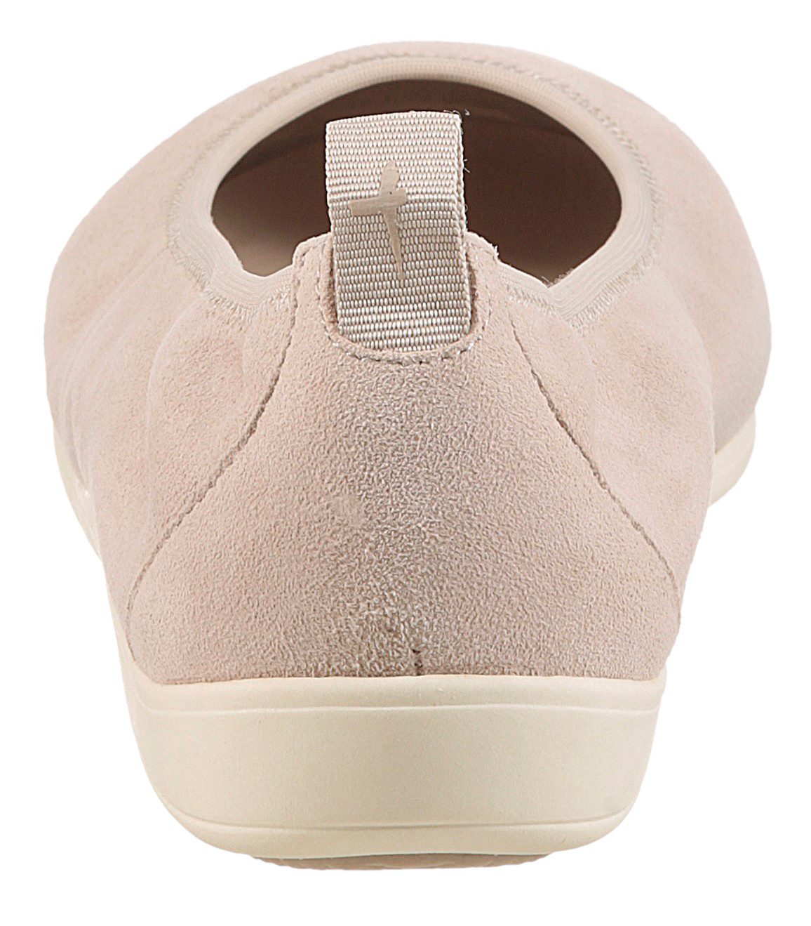 Das Obermaterial aus Ziegenveloursleder ist weich und langlebig. Die Synthetik-Sohle der Ballerinas ist leicht profiliert und gibt dir auch auf unebenem Untergrund einen guten Halt. Die herausnehmbare Innensohle aus Synthetik, Textil bietet zusätzliche Flexibilität und ermöglicht die Verwendung individueller Einlagen oder orthopädischer Sohlen. Dank dem Keilabsatz wird eine stabile und dennoch elegante Haltung gewährleistet. Mit ihrer Weite F bieten diese Ballerinas eine bequeme und passgenaue Form für schmale bis normale Füße.