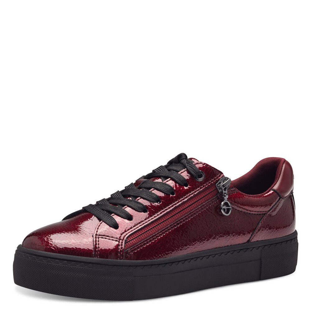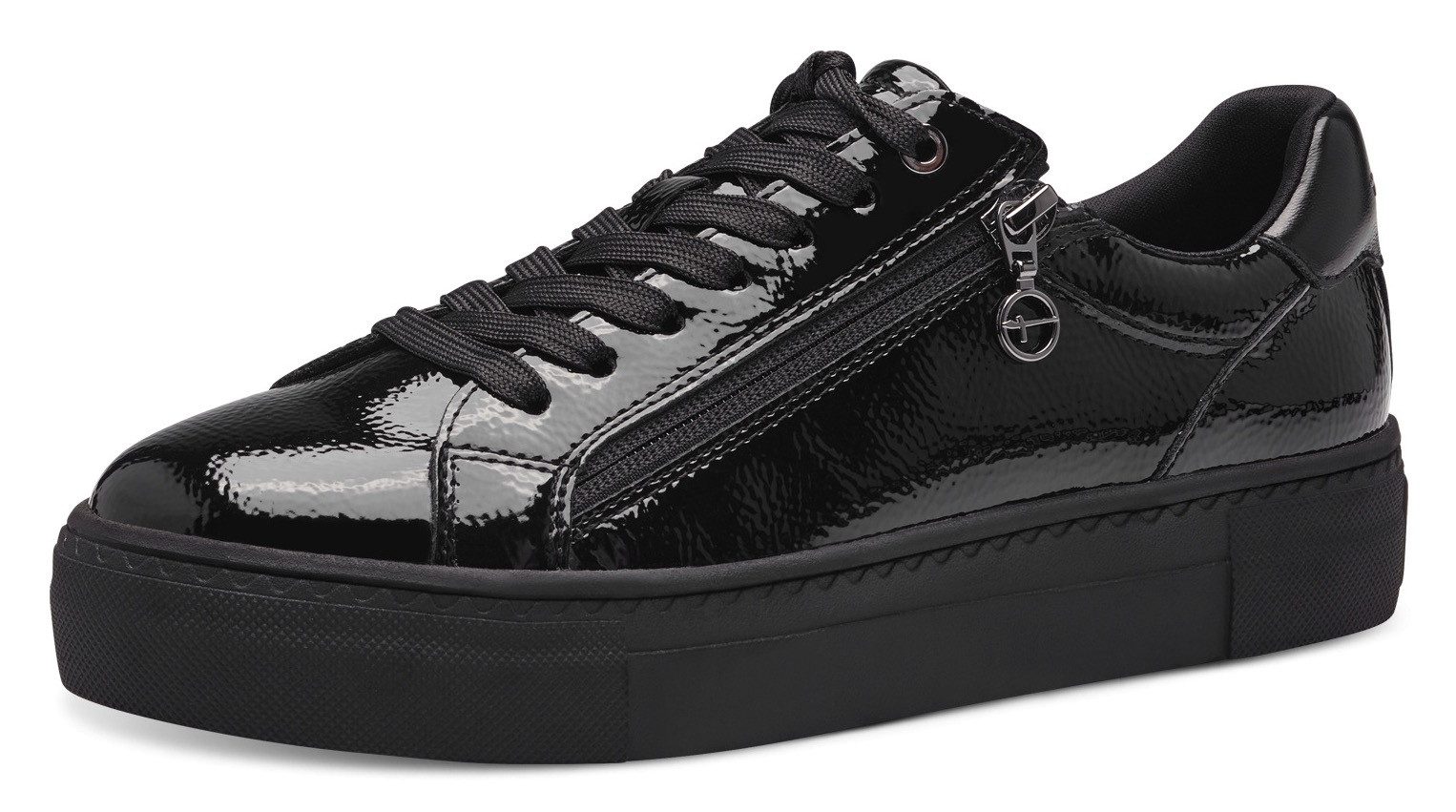 Mit dem Obermaterial aus Lacklederimitat und Lederimitat sind die Schuhe glänzend und unempfindlich gegen Feuchtigkeit. Die leicht profilierte Synthetik-Sohle der Plateausneaker sorgt nicht nur für einen lässigen Look, sondern auch für einen rutschfesten Auftritt. Dank der ca. 3,5 cm hohen Plateausohle erhältst du nicht nur einen modischen Look, sondern auch zusätzlichen Komfort bei jedem Schritt. Die herausnehmbare Innensohle aus Textil bietet zusätzliche Flexibilität und ermöglicht die Verwendung individueller Einlagen oder orthopädischer Sohlen. Der Plateauabsatz bietet mehr Stabilität und Balance. Mit ihrer Weite F bieten diese Plateausneaker eine bequeme und passgenaue Form für schmale bis normale Füße.