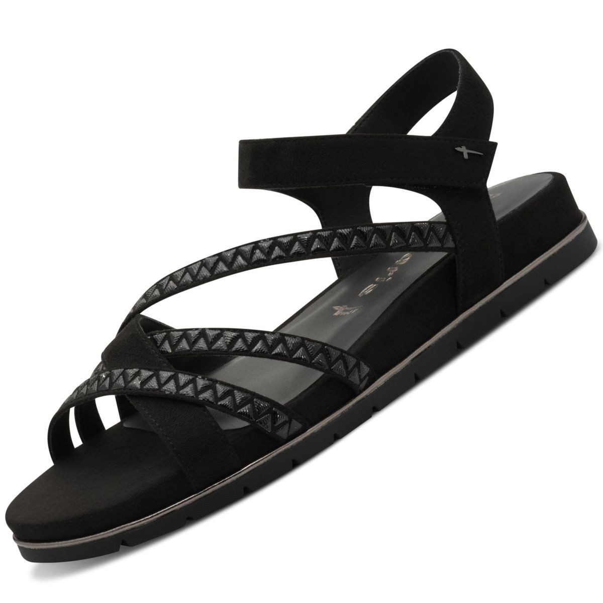 Hübsche Sandalen aus Textil mit gekreuzten Riemchen. Diese sind mit dreieckigen Nieten besetzt. Kinderleichter Einstieg durch eine Klettschnalle. Synthetisches Innenfutter. Weiche Decksohle aus Textil mit Touch-It Fußbett. 2,5 cm hohe Synthetiksohle ohne Absatz.