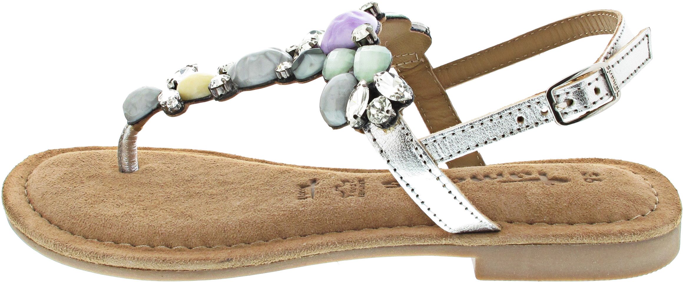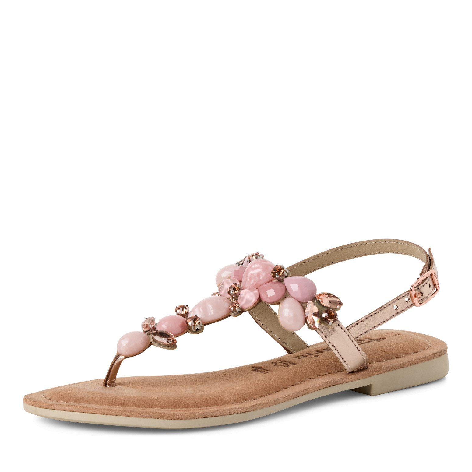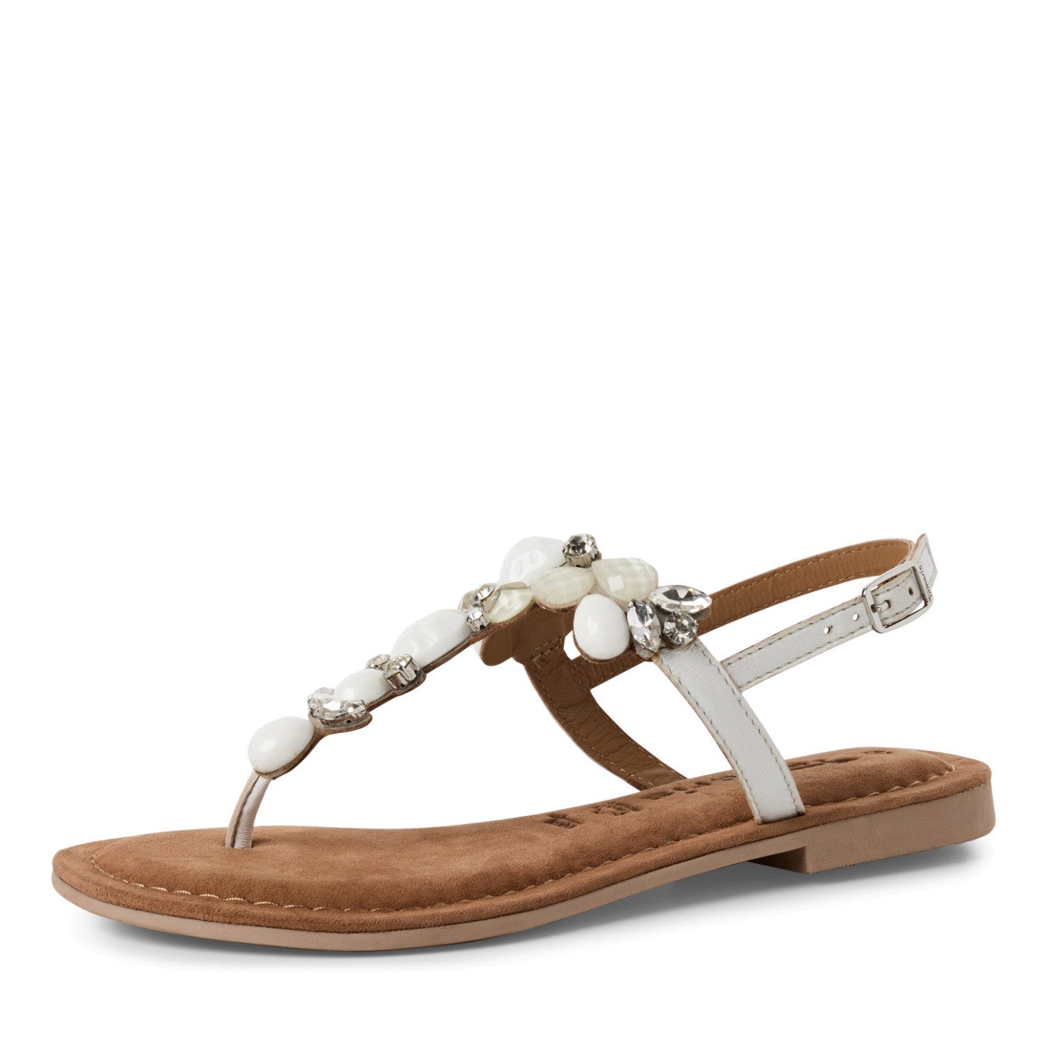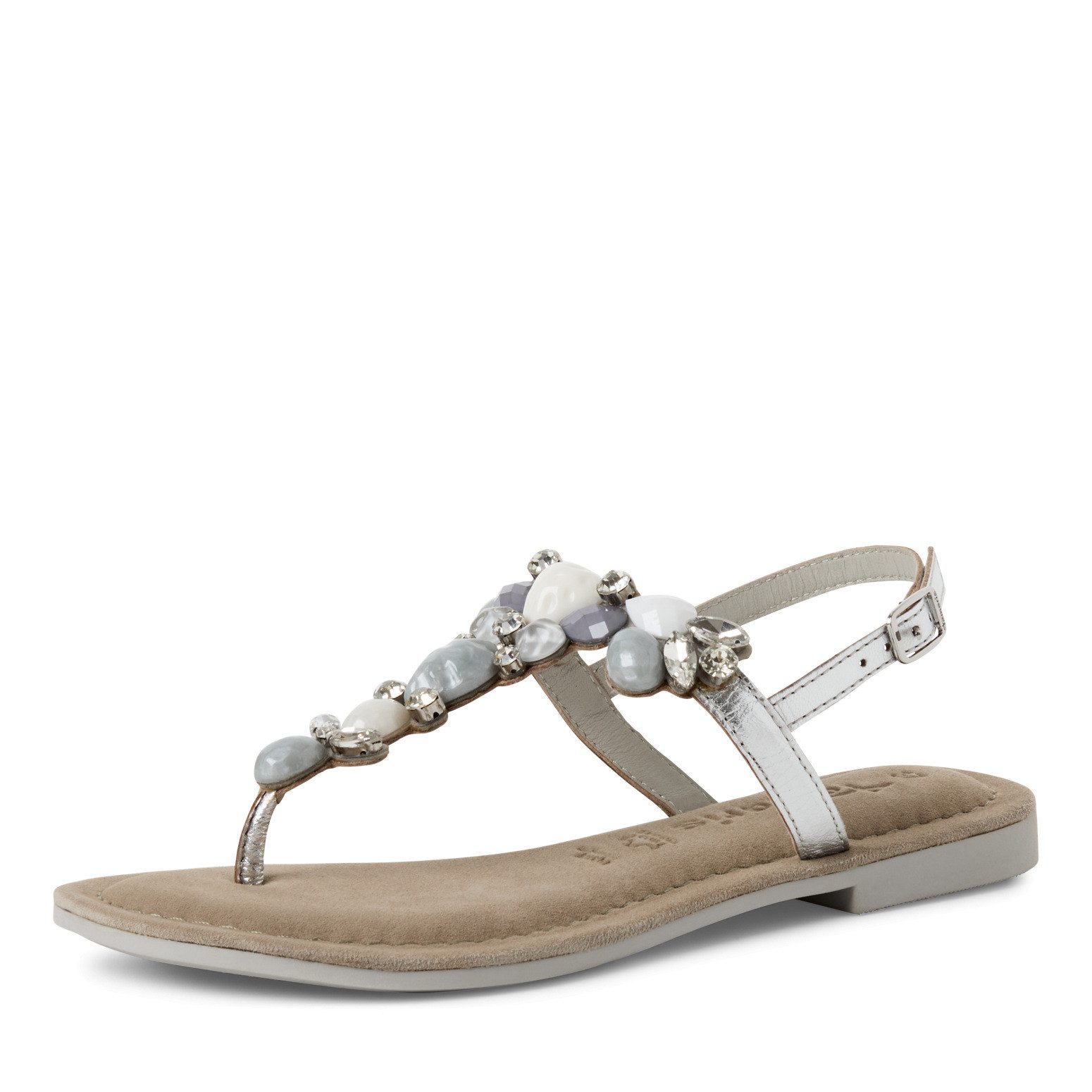 Die Tamaris Damen Zehentrenner-Sandalen in Beige aus einem Rauleder-Textil-Mix bieten eine perfekte Kombination aus Komfort und Eleganz für die Sommermonate. Diese T-Steg-Sandalen sind mit zierenden Schmucksteinen verziert, die dem Schuh einen Hauch von Glamour verleihen und ihn zu einem echten Hingucker machen.