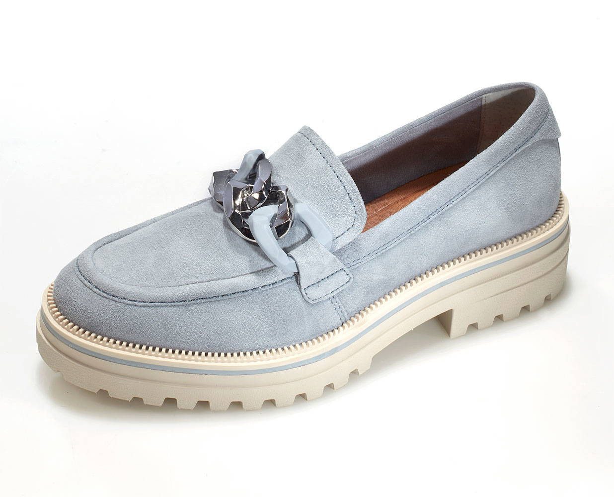 Der Damen Loafer aus weichem Veloursleder vereint klassischen Stil mit zeitgemäßem Design. Seine elegante Zierkette und die sportliche, rutschhemmende Profilsohle machen ihn zu einem vielseitigen Begleiter für verschiedene Anlässe.