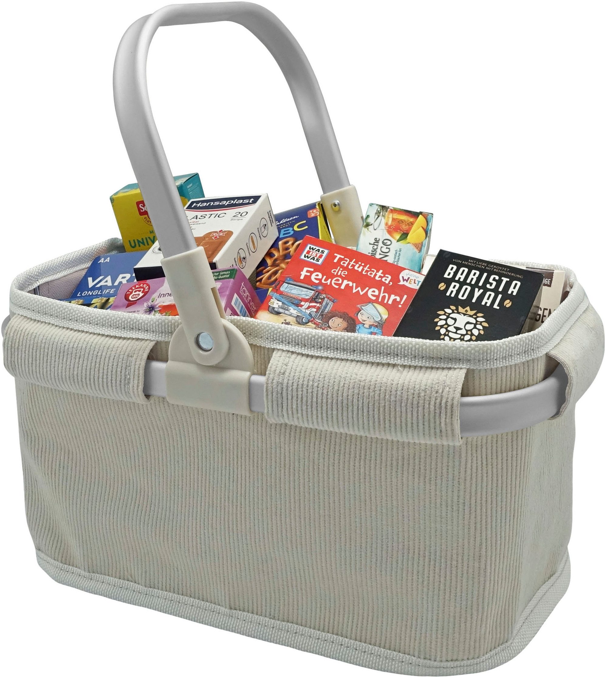 Praktischer Tragekorb aus stylishem Cord-Stoff in Beige gefüllt mit vielerlei Miniaturfaltschachteln für den Kinderkaufladen. Aufklappbar und mit verstellbarem Tragehenkel versehen. Das authentische Design der Miniaturen bildet Originalverpackungen von bekannten Marken nach und sorgt für viele unvergessliche Kaufladenspiele. Die Marken-Miniaturen sind mit der Tanner Scannerkasse anhand der blauen Barcodes scannbar. Eine optimale Ergänzung und Erweiterung für jeden Kinderkaufladen. Ideal für kreative Rollenspiele rund um die Themen Lebensmittel und Einkaufen. Fördert spielerisch die Entwicklung von Fantasie und sozialen Fähigkeiten von Kindern. Perfekt geeignet für Sammler und Liebhaber von Miniaturen, als Dekoration oder Geschenk. Die Zusammenstellung der Miniaturfaltschachteln erfolgt zufällig und kann daher vom Bild abweichen.