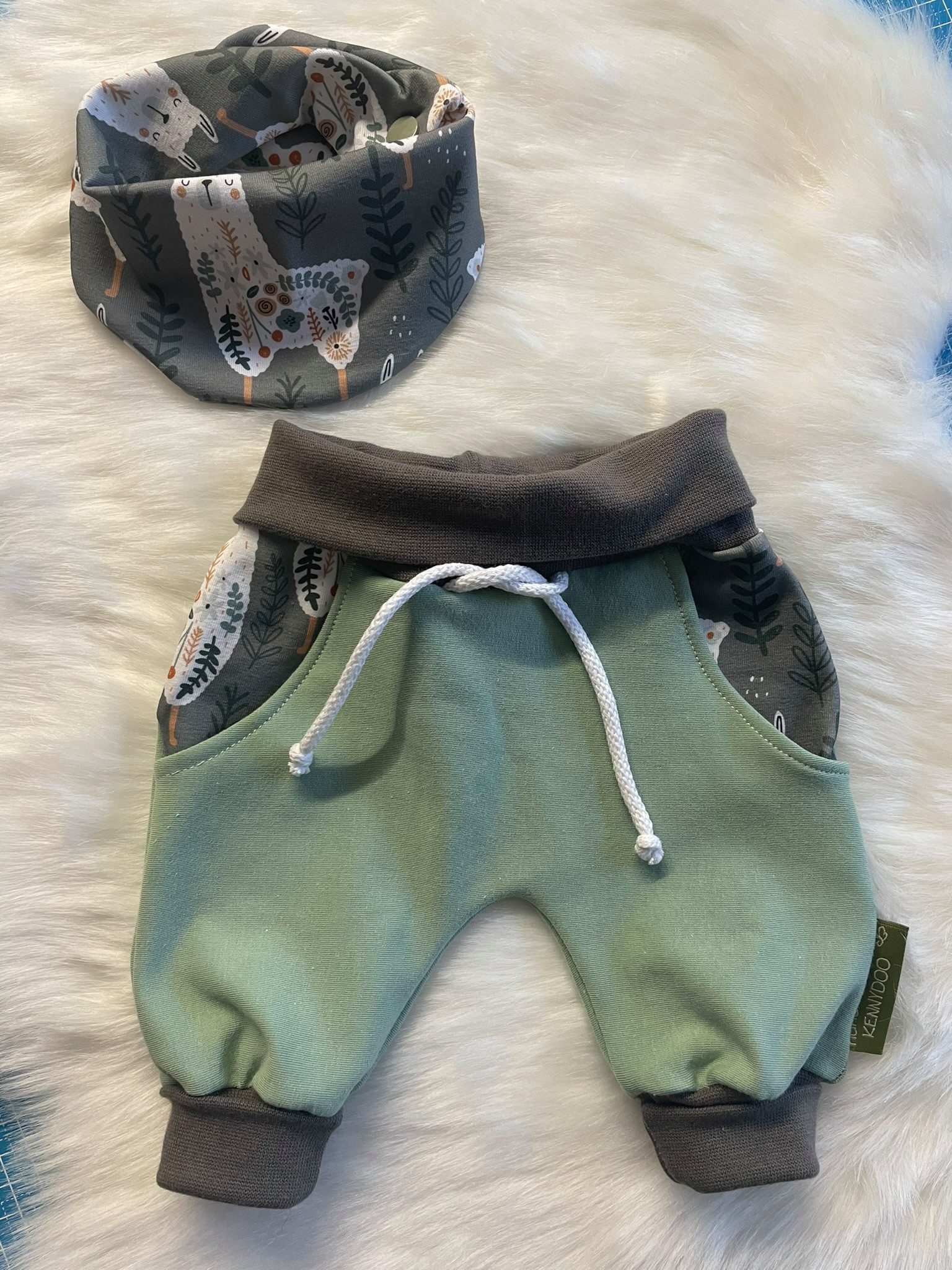 Das Set besteht aus einer mitwachsenden Jumper-Babyhose (Pumphose) zum Krempeln, mit witzigen Hosentaschen und einem passenden Halstuch