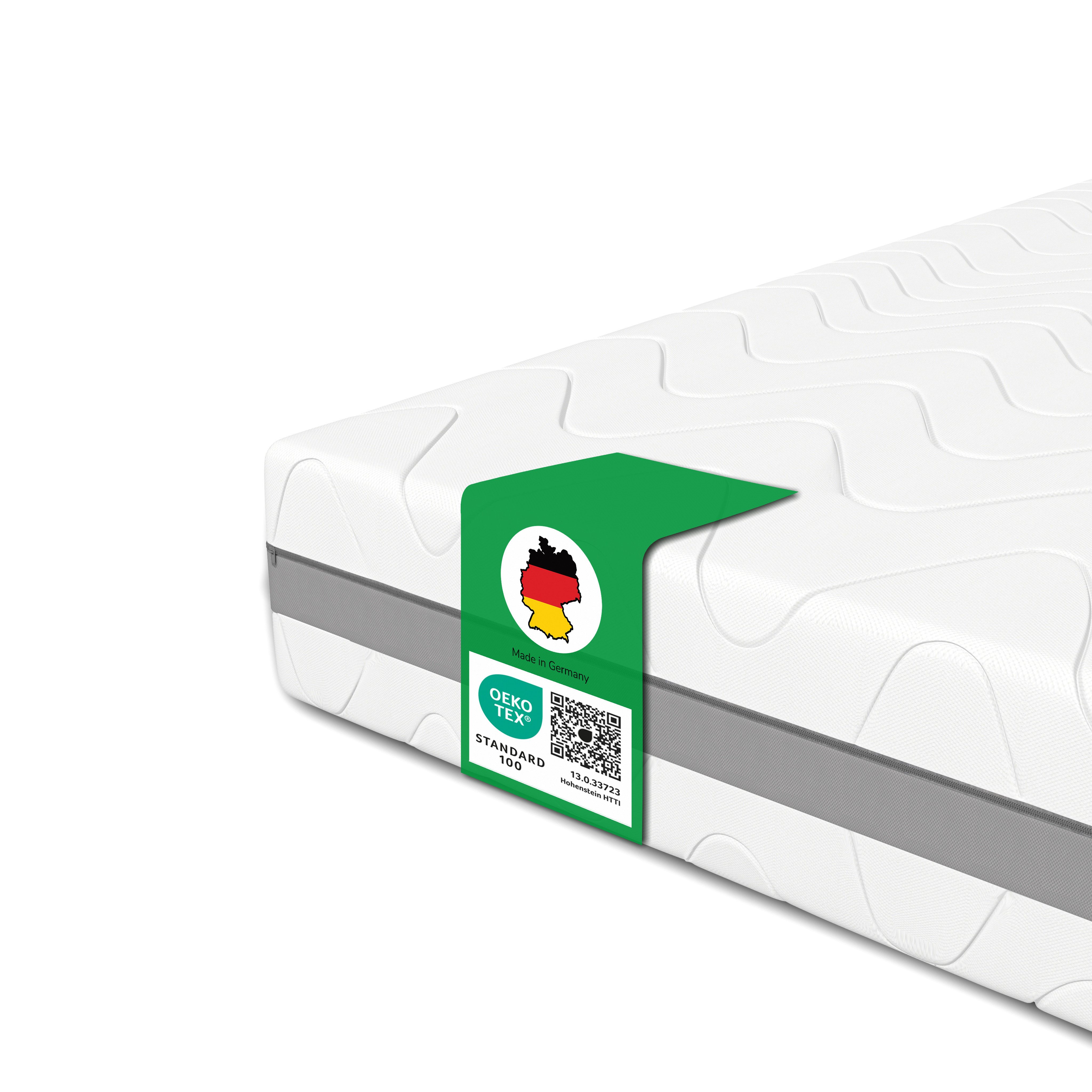 Made in Germany und zertifizierte QualitätHergestellt in Deutschland, erfüllt die Matratze höchste Qualitätsstandards. Sie ist nach OEKO-TEX® STANDARD 100 13.0.33723 Hohenstein HTTI zertifiziert und wird nachhaltig vakuumverpackt als Rollmatratze geliefert. Erlebe den Unterschied und investiere in deinen Schlafkomfort!