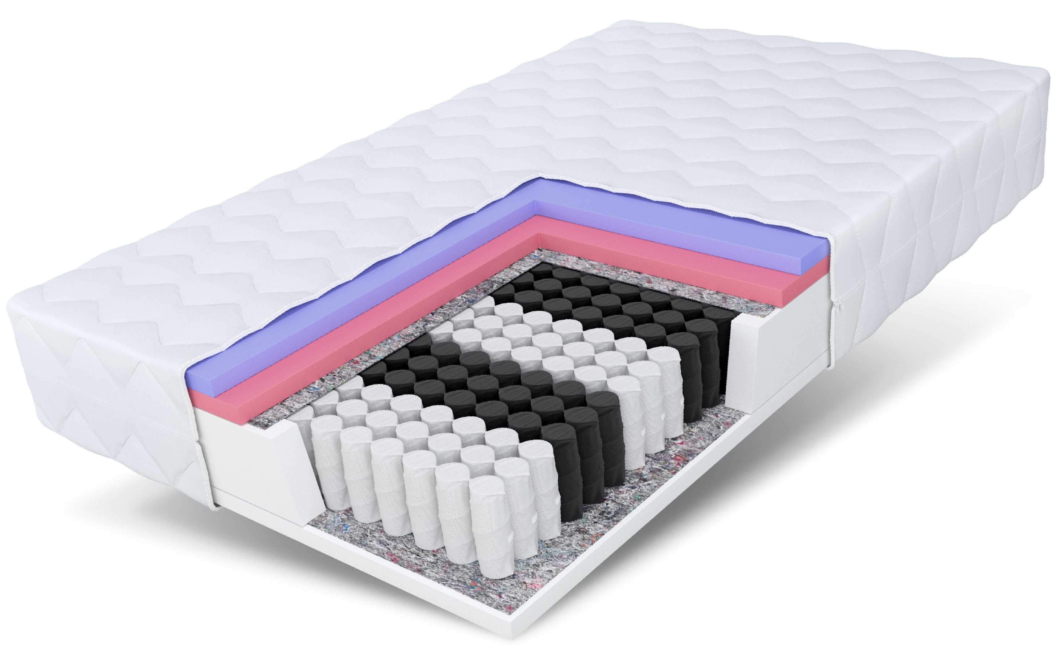 Jede Feder ist separat in einer Stofftasche eingenäht und ist ca. 30% gedehnt, so wird das Risiko des Zusammenbruchs vermieden. Es besteht keine Verbindung zwischen den Federn, der Vorteil ist, dass jede von ihnen unabhängig von der anderen arbeiten kann. Im Vergleich zu konventionellen Matratzen mit Federkern sind die Matratzen mit Taschenfederkern für zwei Personen bestens geeignet.