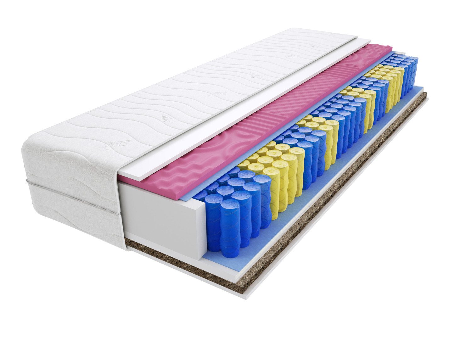 Profilierter Moletschaum - dieser Schaumstoff hat eine Reihe von aufeinanderfolgenden Vertiefungen und Vorsprüngen, die die 7-Zonen-Profilierung der Matratze bilden. Dieser Schaum verbessert die Belüftung der Matratze erheblich. Passt sich perfekt der Körperform an. Es hat eine hohe Dichte, bietet einen sehr guten Widerstand gegen Verformung, verbessert die Durchblutung und hat Massageeigenschaften. Seegras - 100% natürlicher Rohstoff gewöhnt zum Härten der Matratze. Die Seegrasseite ist die harte Seite, hat Belüftungseigenschaften, verhindert übermäßiges Schwitzen, ist antiallergisch und antimykotisch. Es hat einen charakteristischen Geruch von trockenem Gras. Wird für Matratzen mit Aromatherapie verwendet - es wirkt sich positiv auf Entspannung und Schlaf aus. Hochflexibler HR-Schaum - mit einer Dichte von 35 kg/m3 - dieser Schaum besteht aus einer Vielzahl von Luftblasen, sorgt für eine perfekte Körperanpassung, sehr guten Schlafkomfort und garantiert eine perfekte Belüftung der Matratze. Taschenfedern, 9 Zonen (262Stk/1m2) Jede Feder befindet sich in einer separaten Materialtasche und ist nicht mit einer anderen Feder verbunden, funktioniert separat, arbeitet leise! Dank dieser Konstruktion, Wenden und Drehen oder der Gewichtsunterschied der anderen Person ist völlig unmerklich. Gesteppter Bezug - hypoallergenes, antiallergisches Material, mit einem L-förmigen Reißverschluss. Wichtig: Der Bezug kann je nach Размер eine andere Anordnung von Inschriften und Zeichen aufweisen. Das Bezugsmuster kann geringfügig von dem auf dem Foto gezeigten abweichen. Die in der Visualisierung verwendeten Farben Farben sind illustrativ und können von den tatsächlichen Farben abweichen, die Eigenschaften der einzelnen Ebenen bleiben jedoch erhalten.