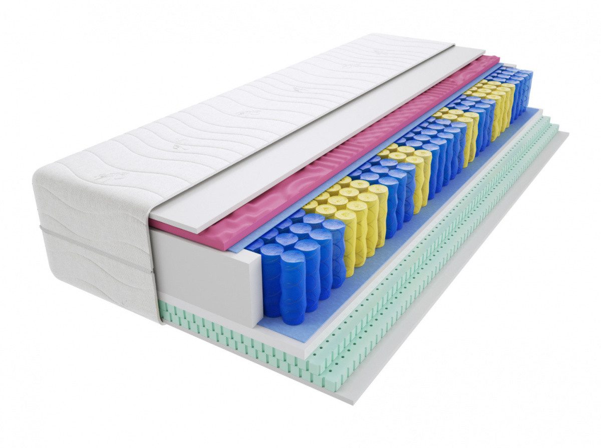 2x Latex - die Verwendung dieses Materials wirkt sehr gut auf die Schlafqualität und Elastizität der Matratze aus und reduziert deren Härte. Die Verwendung von Latex erhöht die Luftzirkulation im Inneren der Matratze, dank spezieller Luftkanäle. Profilierter Moletschaum - dieser Schaumstoff hat eine Reihe von aufeinanderfolgenden Vertiefungen und Vorsprüngen, die die 7-Zonen-Profilierung der Matratze bilden. Dieser Schaum verbessert die Belüftung der Matratze erheblich. Passt sich perfekt der Körperform an. Es hat eine hohe Dichte, bietet einen sehr guten Widerstand gegen Verformung, verbessert die Durchblutung und hat Massageeigenschaften. Hochflexibler HR-Schaum - mit einer Dichte von 35 kg/m3 - dieser Schaum besteht aus einer Vielzahl von Luftblasen, sorgt für eine perfekte Körperanpassung, sehr guten Schlafkomfort und garantiert eine perfekte Belüftung der Matratze. Die erhöhte Dichte des HR-Schaums verlängert die Haltbarkeit der Matratze im Vergleich zum oft verwendeten T25-Polyurethanschaum erheblich. Taschenfedern, 9 Zonen (262Stk / 1m2) Jede Feder befindet sich in einer separaten Materialtasche und ist nicht mit einer anderen Feder verbunden, funktioniert separat, arbeitet leise! Dank dieser Konstruktion, Wenden und Drehen oder der Gewichtsunterschied der anderen Person ist völlig unmerklich. Gesteppter Bezug - hypoallergenes, antiallergisches Material, mit einem L-förmigen Reißverschluss. Wichtig: Der Bezug kann je nach Размер eine andere Anordnung von Inschriften und Zeichen aufweisen. Das Bezugsmuster kann geringfügig von dem auf dem Foto gezeigten abweichen. Die in der Visualisierung verwendeten Farben Farben sind illustrativ und können von den tatsächlichen Farben abweichen, die Eigenschaften der einzelnen Ebenen bleiben jedoch erhalten.