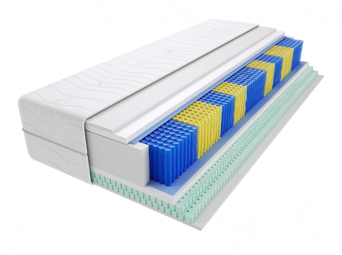2x Latex - die Verwendung dieses Materials wirkt sehr gut auf die Schlafqualität und Elastizität der Matratze aus und reduziert deren Härte. Die Verwendung von Latex erhöht die Luftzirkulation im Inneren der Matratze, dank spezieller Luftkanäle. Eine Latexmatratze passt sich der Körperform viel besser an, stützt sie gleichmäßig, was zu einer besseren und richtigen Durchblutung beiträgt. Hochflexibler HR-Schaum - mit einer Dichte von 35 kg/m3 - dieser Schaum besteht aus einer Vielzahl von Luftblasen, sorgt für eine perfekte Körperanpassung, sehr guten Schlafkomfort und garantiert eine perfekte Belüftung der Matratze. Die erhöhte Dichte des HR-Schaums verlängert die Haltbarkeit der Matratze im Vergleich zum oft verwendeten T25-Polyurethanschaum erheblich. Multitaschenfederkern 9 Zonen (510 Stk / 1m2) - spielen eine große Rolle bei der Konstruktion der Matratze. Noch besserer Schlafkomfort im Vergleich zum Taschenfederkern - doppelt so viele Stützpunkte. Die doppelte Anzahl der Federn im Vergleich zu einer normalen Taschenfederung erhöht auch die Lebensdauer der Matratze. Jede Feder befindet sich in einer separaten Materialtasche, ist nicht mit einer anderen Feder verbunden, funktioniert separat, arbeitet leise! T25-Schaum - hochwertiger Polyurethanschaum sorgt für eine gute Durchblutung, anatomische Körperanpassung der Matratze. Gesteppter Bezug - hypoallergenes, antiallergisches Material, mit einem L-förmigen Reißverschluss. Wichtig: Der Bezug kann je nach Размер eine andere Anordnung von Inschriften und Zeichen aufweisen. Das Bezugsmuster kann geringfügig von dem auf dem Foto gezeigten abweichen. Die in der Visualisierung verwendeten Farben Farben sind illustrativ und können von den tatsächlichen Farben abweichen, die Eigenschaften der einzelnen Ebenen bleiben jedoch erhalten.