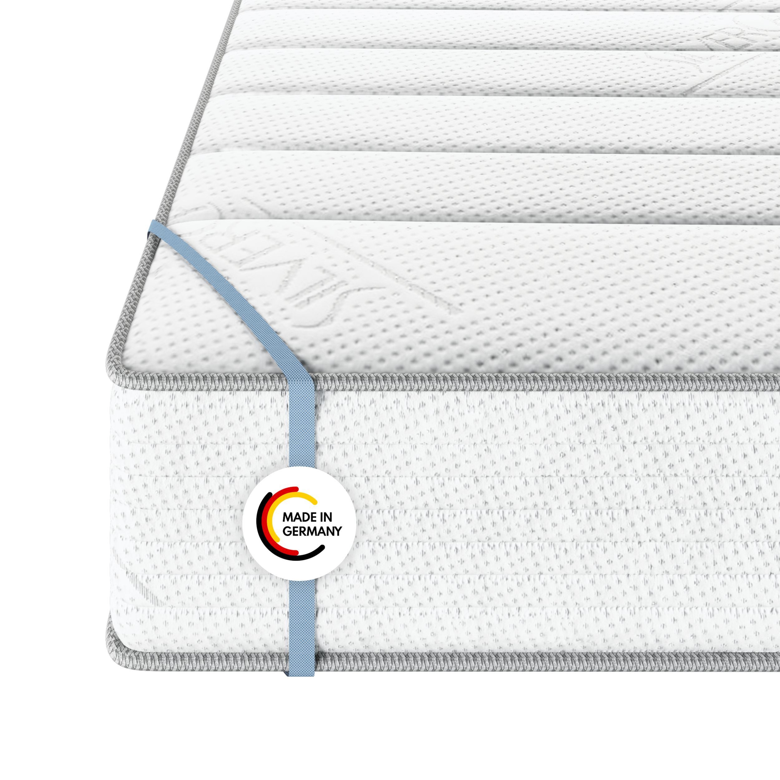 UnsereMedicSilver besteht aus einem hochwertigen 7 Zonen Taschenfederkern mitAuflagen und Seitenstegen aus hochwertigen Kaltschaum. Während der Kaltschaumsie einsinken lässt, stützen die Federkerne je nach Zone ihren Körperunterschiedlich stark. Federkerne sorgen durch die Bewegungen im Schlaf füreinen guten Feuchtigkeitsabtransport und einer perfekte Durchlüftung. JedeFeder ist einzeln in einer Tasche eingenäht. Dadurch kann sich jeder Punkt derMedicSilver perfekt Ihrem Körper anpassen. Die Bewegungsenergien werden punktuellabsorbiert, sodass die Bewegungen des Partners kaum zu spüren sind. Sie liegenruhig und entspannt. Ein weiteres Highlight ist der hochwertige Borderbezug derMarke "Silvercare". Er besitzt vier Trage- bzw. Wendegriffe und einen4-Seiten-Reißverschluss, was das Auf- und Abziehen des Bezugs sehr vereinfacht.Die eingewebten Silberfäden wirken antibakteriell und sorgen für einenangenehmen und hygienischen Schlaf. Der Bezug ist gesteppt und auf beidenSeiten unterschiedlich stark gefüttert. Die Sommerseite mit der Liniensteppungist etwas dünner gefüttert und sorgt für einen schnelleren Wärmeabtransport.Die Winterseite mit der Wellensteppung hingegen speichert die Wärme stärker fürden angenehmen Schlaf in der kalten Jahreszeit.