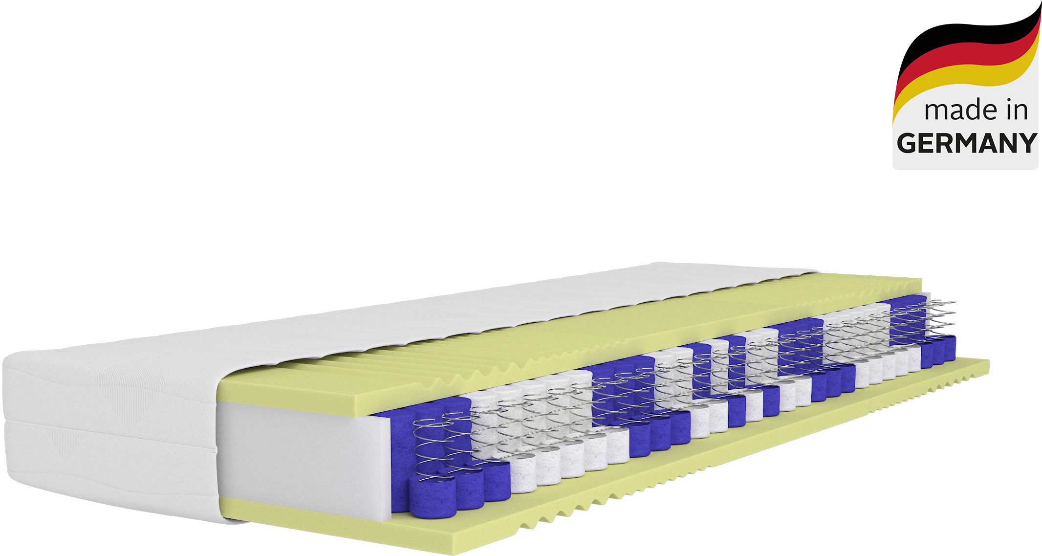Kernaufbau | Komfortschaum (ca. 4cm hoch - 32 kg/m³-HG 2; 36 kg/m³-HG 3; 39 kg/m³-HG 4 ), Taschenfederkern (ca. 12 cm hoch, 500 Federn beim Federkernmaß 100 x 200 cm), Komfortschaum (ca. 4cm hoch - 32 kg/m³-HG 2; 36 kg/m³-HG 3; 39 kg/m³-HG 4 ) |