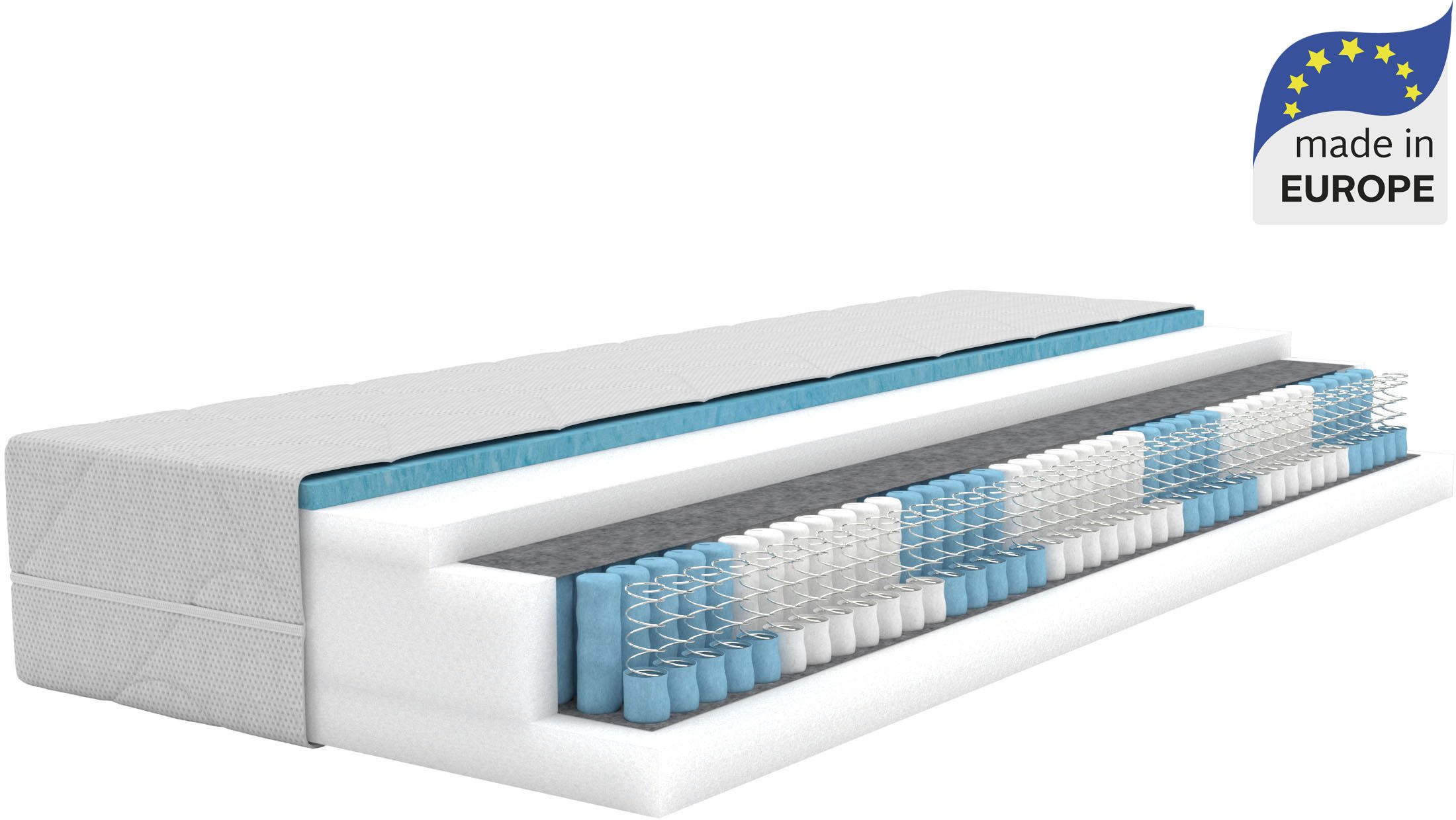 Kernaufbau | Hypersoftschaum (glatt, 2,5 cm, 37 kg/m³), Komfortschaum (glatt, 4 cm hoch, 28 kg/m³), Tonnentaschenfederkern (13 cm hoch, 1000 Federn bei 100x200 cm), Komfortschaum (glatt, 6,5 cm hoch, 28 kg/m³) |