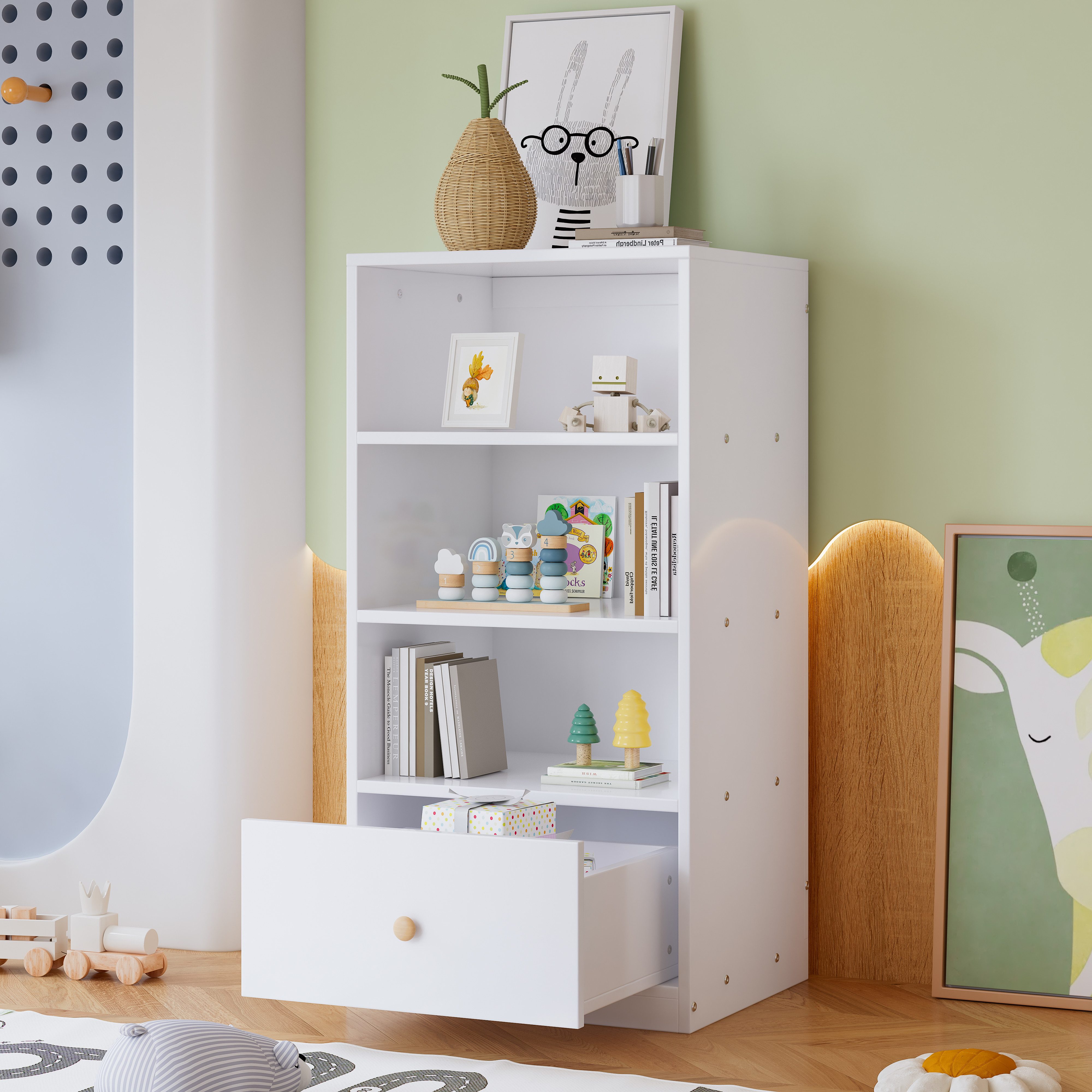 Das Bücherregal mit drei Einlegeböden und geräuschlosen Gleitern in der Schublade bietet eleganten Stauraum für Bücher und Gegenstände. Die holzfarbenen Griffe ergänzen das weiße MDF-Gehäuse perfekt. Ideal für Schlafzimmer, Wohnzimmer oder Büros.
