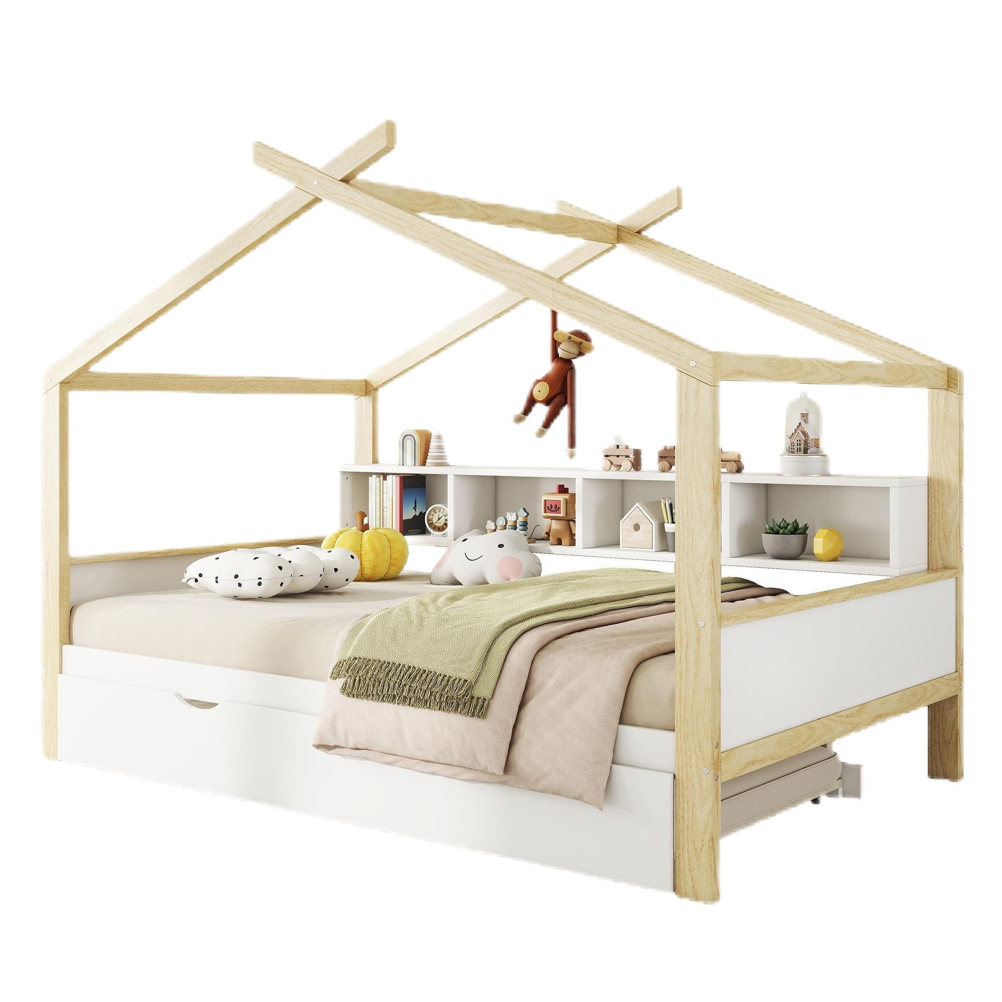 Das Bett in diesem Kinderzimmer besteht aus umweltfreundlichem und gesundem Kiefernholz und MDF, das den Sicherheitsstandards für Kindermöbel entspricht. Das schlichte und modische Design mit glatten Linien und einzigartigen Formen passt perfekt zum modernen Wohnstil und schafft einen warmen und komfortablen Raum für Kinder. Ein integriertes kleines Bücherregal neben dem Bett ermöglicht den Kindern einfachen Zugriff auf Bücher und Schulmaterial, was ihre Lesegewohnheiten fördert. Das ausziehbare Unterbett nutzt den Raum optimal und bietet zusätzliche Funktionen. Zusammengefasst: Dieses Bett ist umweltfreundlich, stilvoll, praktisch und platzsparend, ideal für jedes Kinderzimmer.