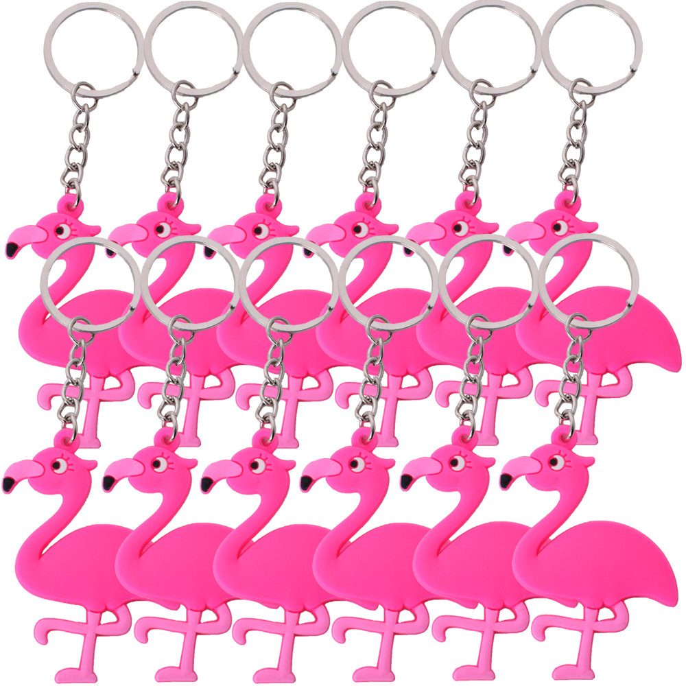 12 tolle Anhänger Set mit stabiler Kette und Ring in Form eines Flamingos pink in der klassischen und bekannten Haltung auf einem BeinDer exotische Wasservogel ist ca. 65x55mm groß uns besteht aus elastischem Kunststoff. Die Kette ist ca. 30mm lang und mündet in einen Schlüsselring mit 25mm Durchmesser.