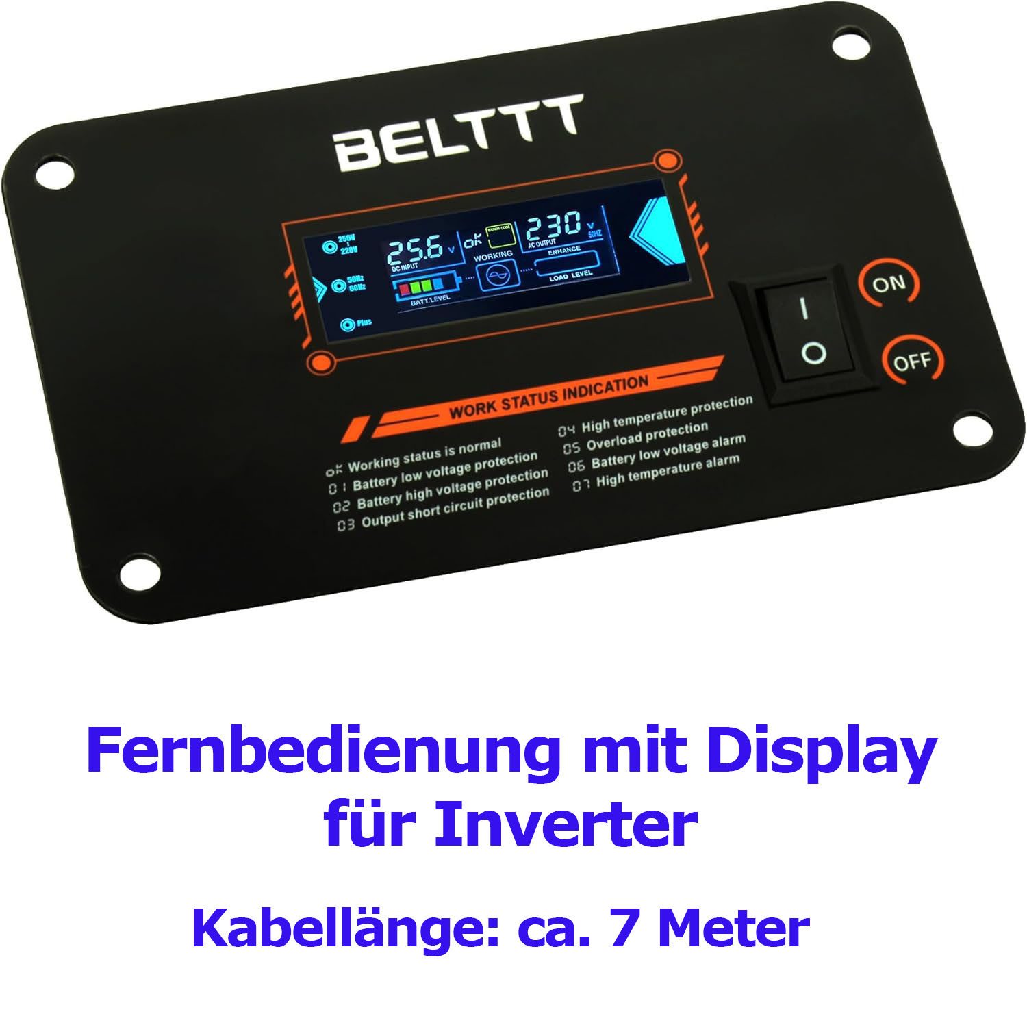 Mit der optionalen Fernbedienung kann der Wechselrichter bequem gesteuert werden. Das Verbindungskabel hat eine Длина von etwa 7 Metern, was Flexibilität bei der Platzierung ermöglicht. Auf dem LED-Display des Fernbedienungspanels können Sie den Betriebszustand des Wechselrichters überwachen und ihn nach Bedarf ein- oder ausschalten.
