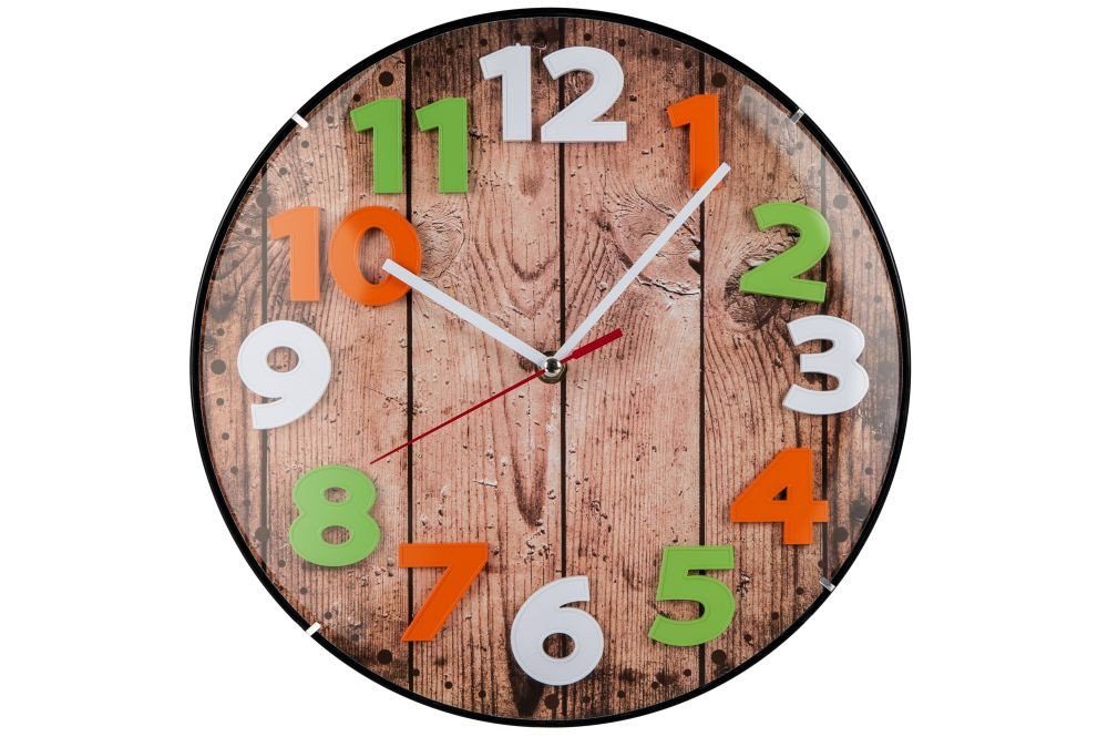 Farbe: Holzoptik | Material: Kunststoff | Maße: Ø 30 cm | Zeiger: weiß | Sekundenzeiger: rot | Zahlen: grün, weiß, rot | Batterie: 1 x AA Mignon LR06 ( nicht enthalten) | Lieferumfang: Quarzwanduhr |