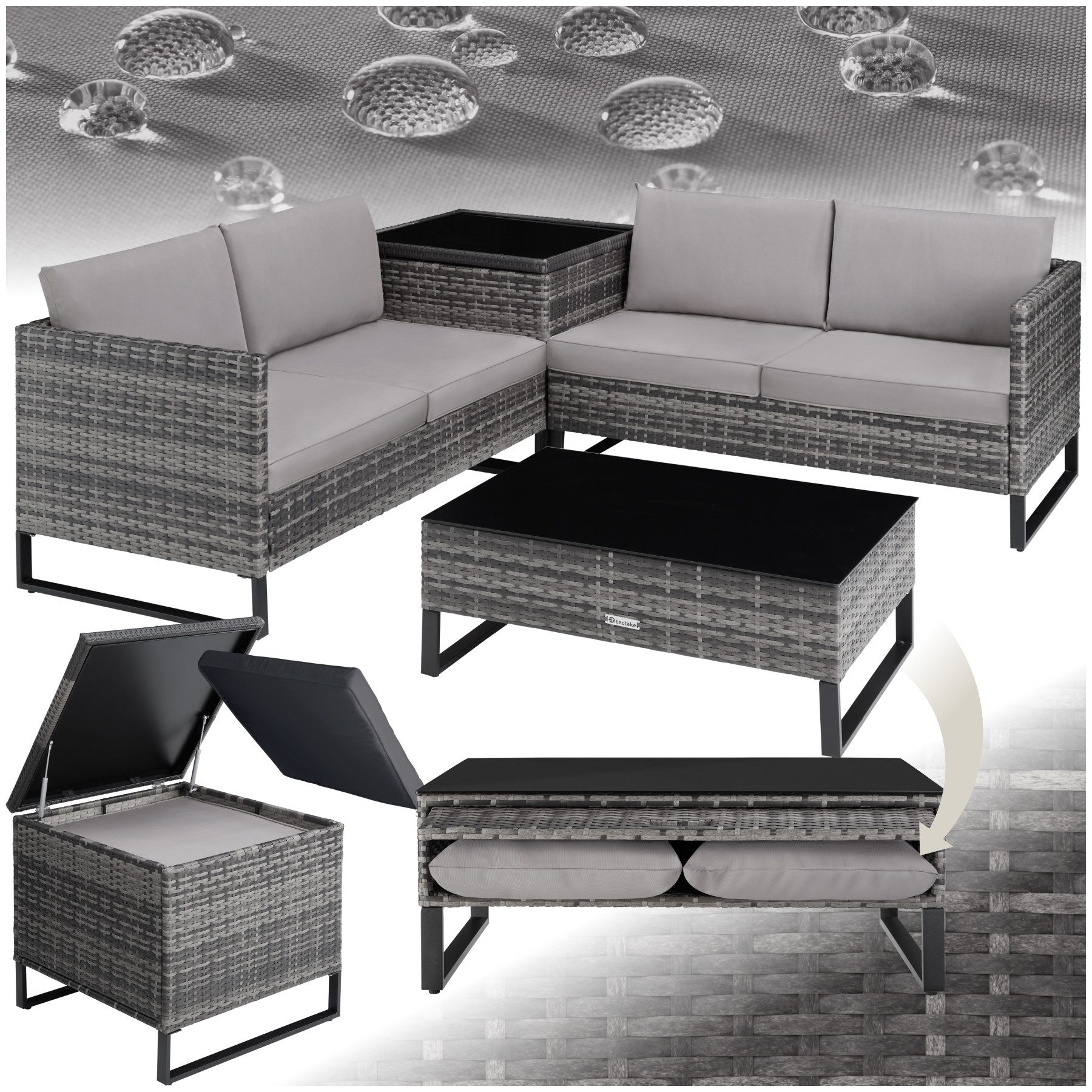 Lieferumfang | 2 Sofas mit Sitz- und Rückenpolstern, 1 Tisch mit Glasplatte, Aufbewahrungsbox mit Glasoberfläche, Montagematerial und Mo |