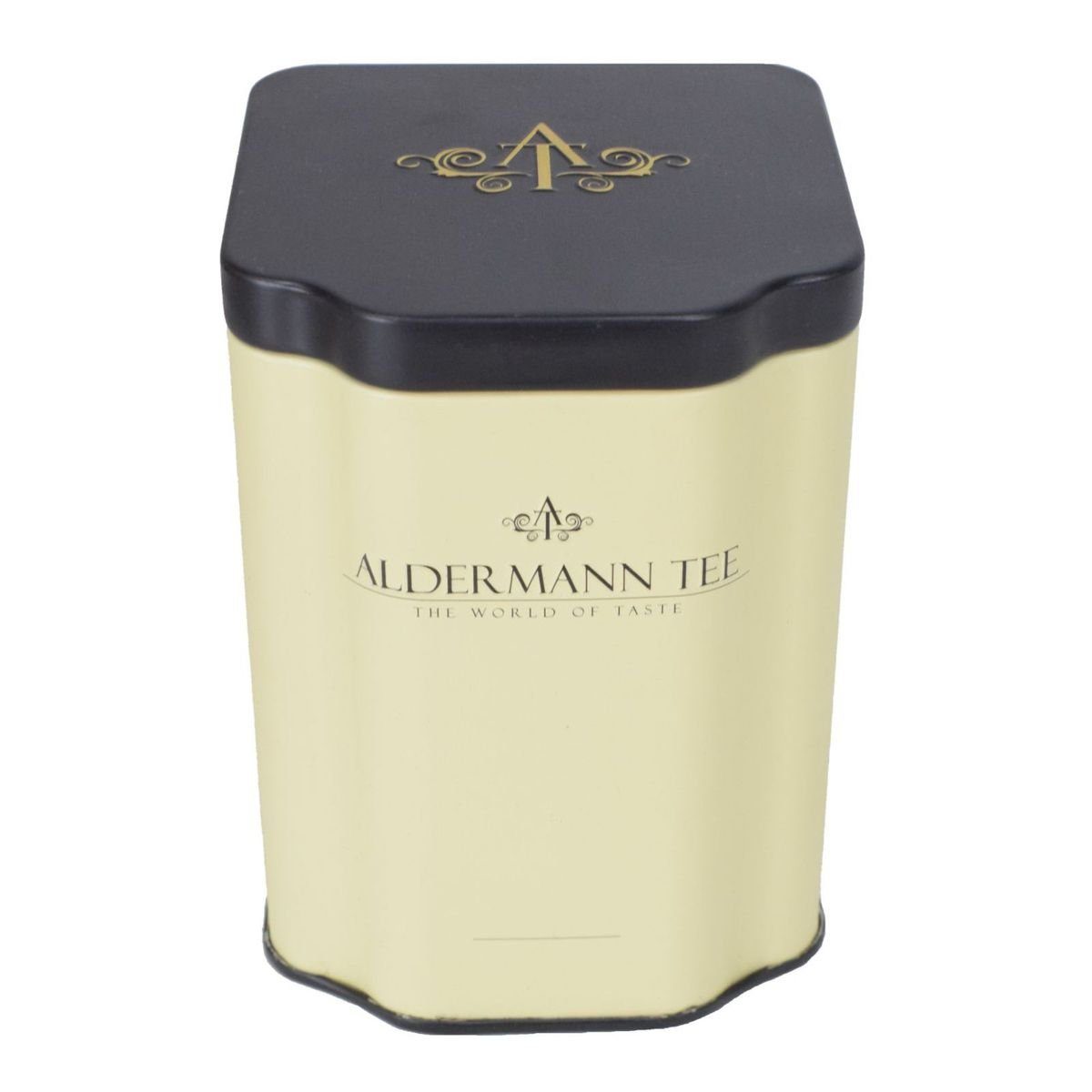 Diese Teedose besticht durch Ihre anmutige Form und eleganten Farbkonzept. Den schwarzen Deckel zieren goldene Initiale und bilden einen schönen Kontrast zur cremefarbenen Dose mit schwarz abgesetzten Boden. Auf der Dose ziert der Schriftzug "Aldermann Tee - The World of Taste" die Front, ein Unterstrich lädt dazu ein, jede Dose individuell zu beschriften. Egal ob Tee oder Gewürze, Backzutaten oder als Aufbewahrungsbox für Kleinkram.