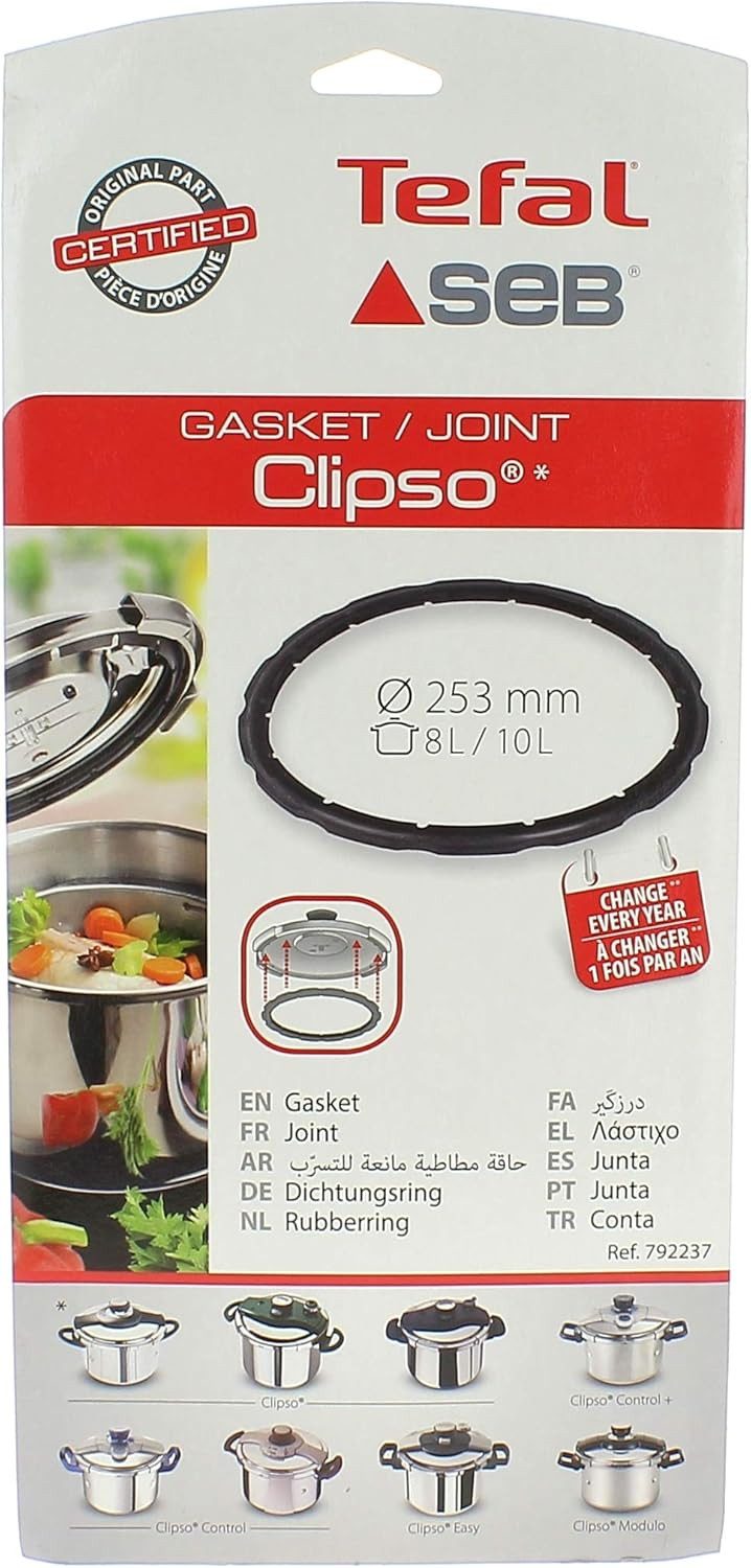 Original Tefal 8L 10L Clipso Schnellkochtopf 253mm Gummidichtung Dichtungsring Original Tefal Schnellkochtopf Ersatzdichtung Passend für Clispo-Modelle: 4104 4105 4106 4156 4157 4168 4156 4157 4168 Der Durchmesser beträgt 253 mm (Pfanne, NICHT Deckel) Original Tefal 8L 10L Clipso Schnellkochtopf 253mm Gummidichtung Dichtungsring Beschreibung Original Tefal Clipso, Clipso Control, Clipso Control Plus, Clipso Easy, Clipso Inox, Clipso Modulo, Ersatz-Gummidichtungsring für Schnellkochtöpfe (253 mm), Ersatzteil für 8-Liter- und 10-Liter-Töpfe. Tefal empfiehlt, die Dichtung Ihres Schnellkochtopfs einmal jährlich auszutauschen, um die Integrität und Dichtheit Ihres Geräts aufrechtzuerhalten. Durchmesser: 253mm Bitte beachten Sie, dass sich der Dichtungsdurchmesser auf den Topf des Schnellkochtopfs bezieht und NICHT auf den des Deckels. Passend für Tefal-Modelle: CLIPSO 4105 4106 4109 4115 4118 4119 4120 4146 4147 4156 4157 4168 4169 P4001 P4051 P4061 P4081 P4091 P4111 P4122 P4141 P4192 P4202