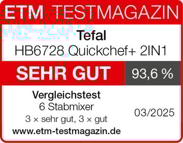 Der Tefal HB6728 Quickchef+ 2IN1 erzielt im Vergleichstest des „ETM TESTMAGAZINS“ mit fünf weiteren Stabmixern das Gesamtergebnis „sehr gut (93,6 %)“. Die „sehr gute“ Pürierleistung glänzt bei Weichem und Hartem. Das Gerät ist sehr einfach aufzubauen, zu bedienen und zu reinigen. Die Sicherheit ist hoch. Außerdem ist es „sehr gut“ verarbeitet. Insgesamt erreicht das Modell das zweitbeste Ergebnis des Testspektrums.