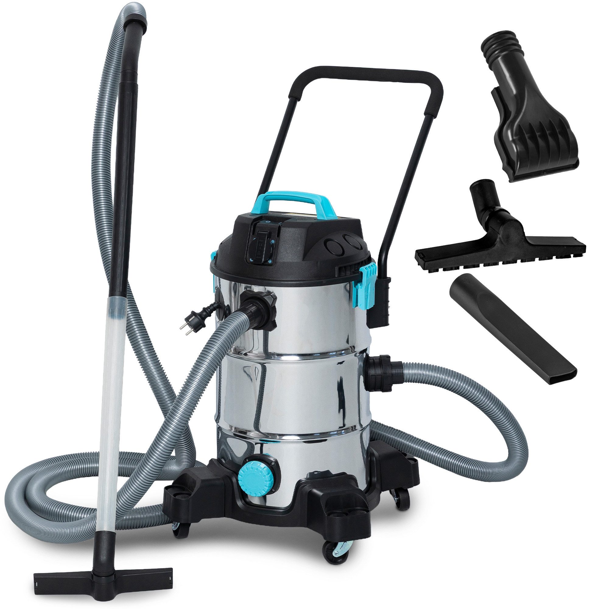 Ausstattung | Teichsauger 3 Saugdüsen 4 Verlängerungsrohre Ansaugschlauch 4m Ablassschlauch 1.5m 4 Räder Schmutzfangbeutel Schaumstofffilter |